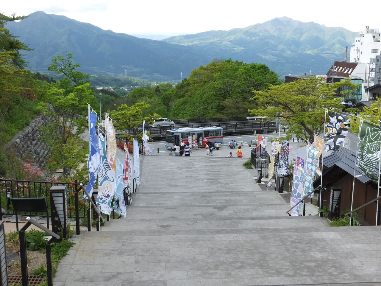 おすすめは中間であるロープウェイの駅のとなりの駐車場がやや安価なので、石段の中段に出て登り、降り、ゆるやかな坂で駐車場に登る。これが温泉街の散策を兼ねてちょうどよかったです。