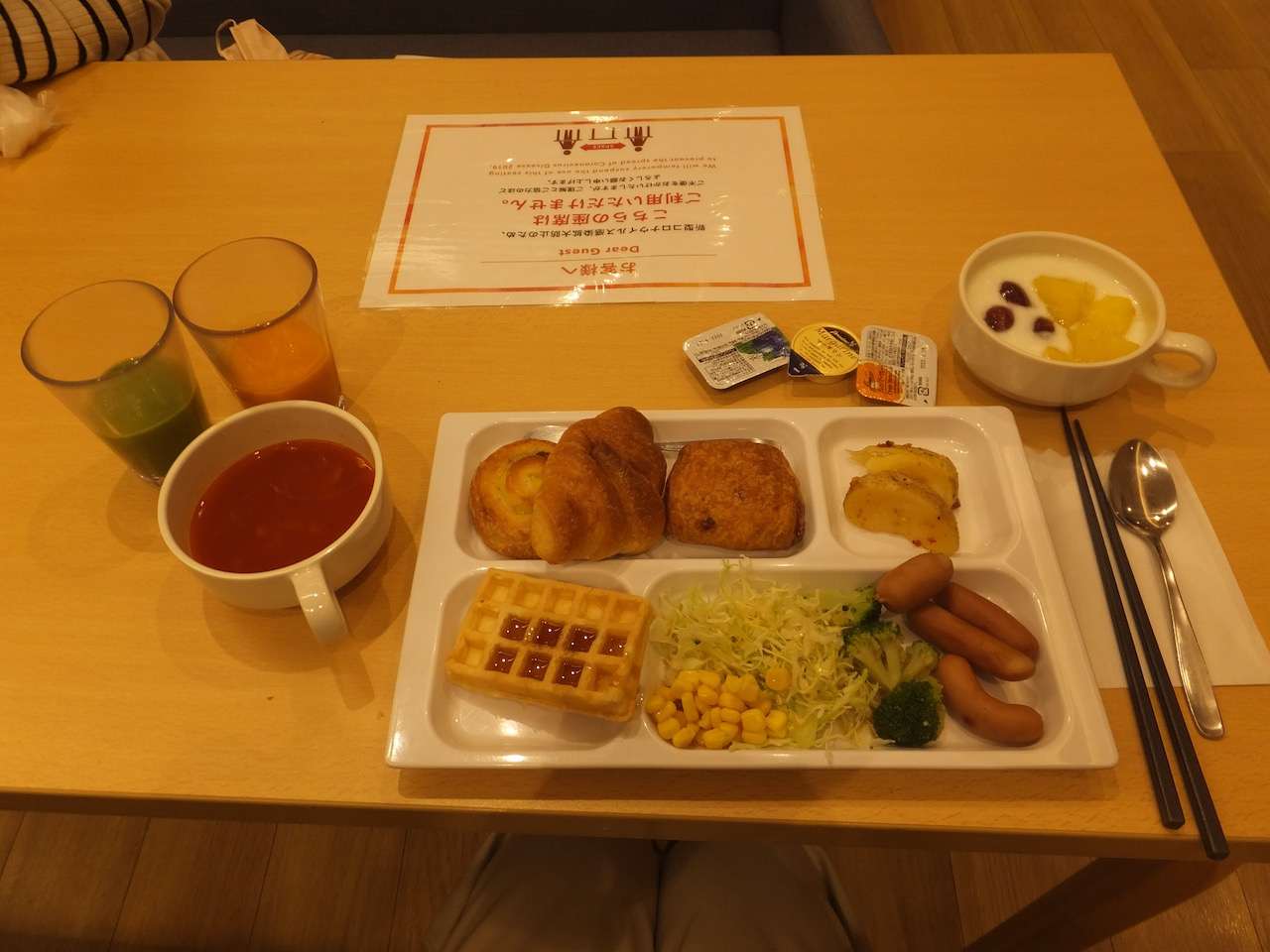 朝食バイキングは通常期のレベル。消毒は常に、という感じで安心感。