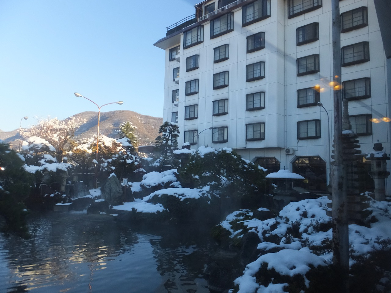錦鯉のおよぐ和風庭園の周囲を建物が囲う感じの街中の石和温泉の標準的なつくりですが屋上に露天風呂があって眺めがいいのはいいです。
