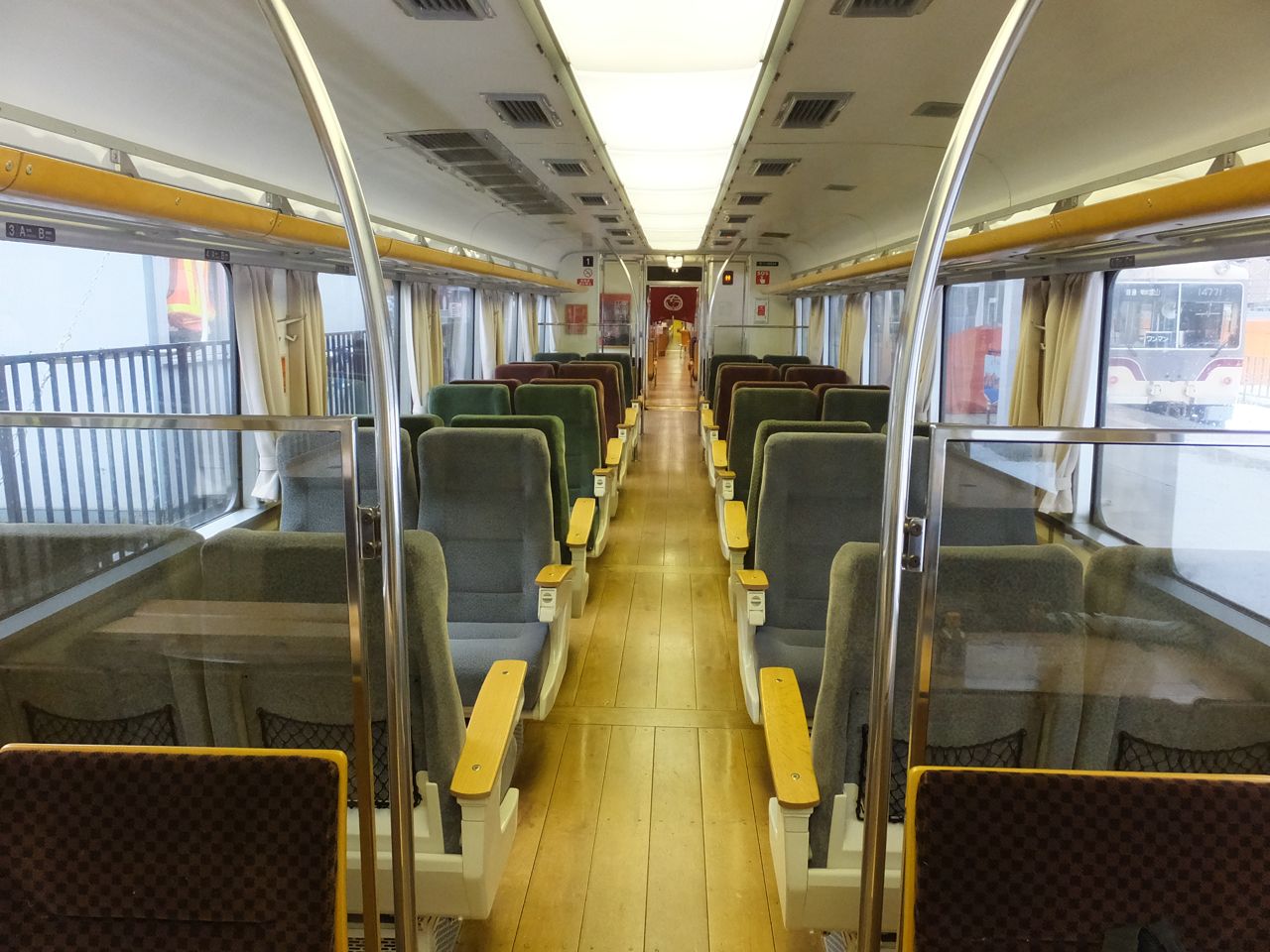車内はところどころ木で作り替えられ、落ち着いた感じになりました。座席で作り替えられた部分は末端のボックスシート部ですが、個室感もなくリクライニングしないので、普通のシートの方がいいと思いました。2号車に売店があり、女性乗務員が常駐していましたが、全体で10人もいない乗車率だったので手持ち無沙汰でした。
