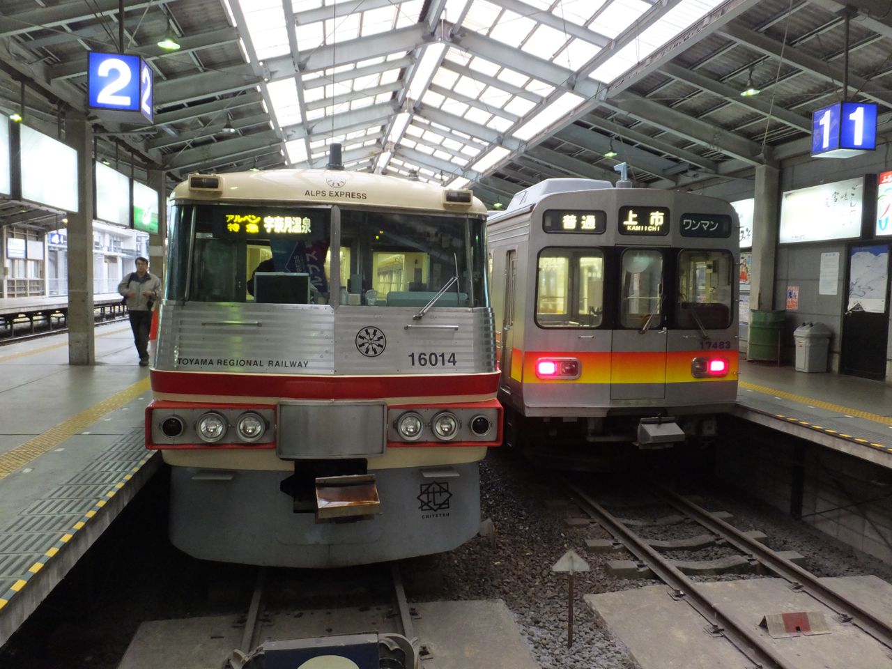 さて、観光特急ではありますが、魚津から富山まで車窓に雄大な立山連峰がずっと見えている車窓なので、どこかがとくに見晴らしがいい、というわけはなく、実際、徐行観光案内は魚津と滑川の間の1カ所だけでした。普通の特急としての役割もあるのであまりゆっくり走るわけにもいかないのでしょう。たしかにスピードは速く、行きに各駅停車で1時間50分かかった宇奈月温泉と富山の間を1時間6分でした。