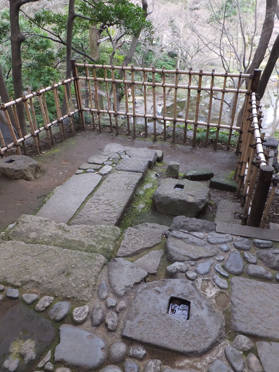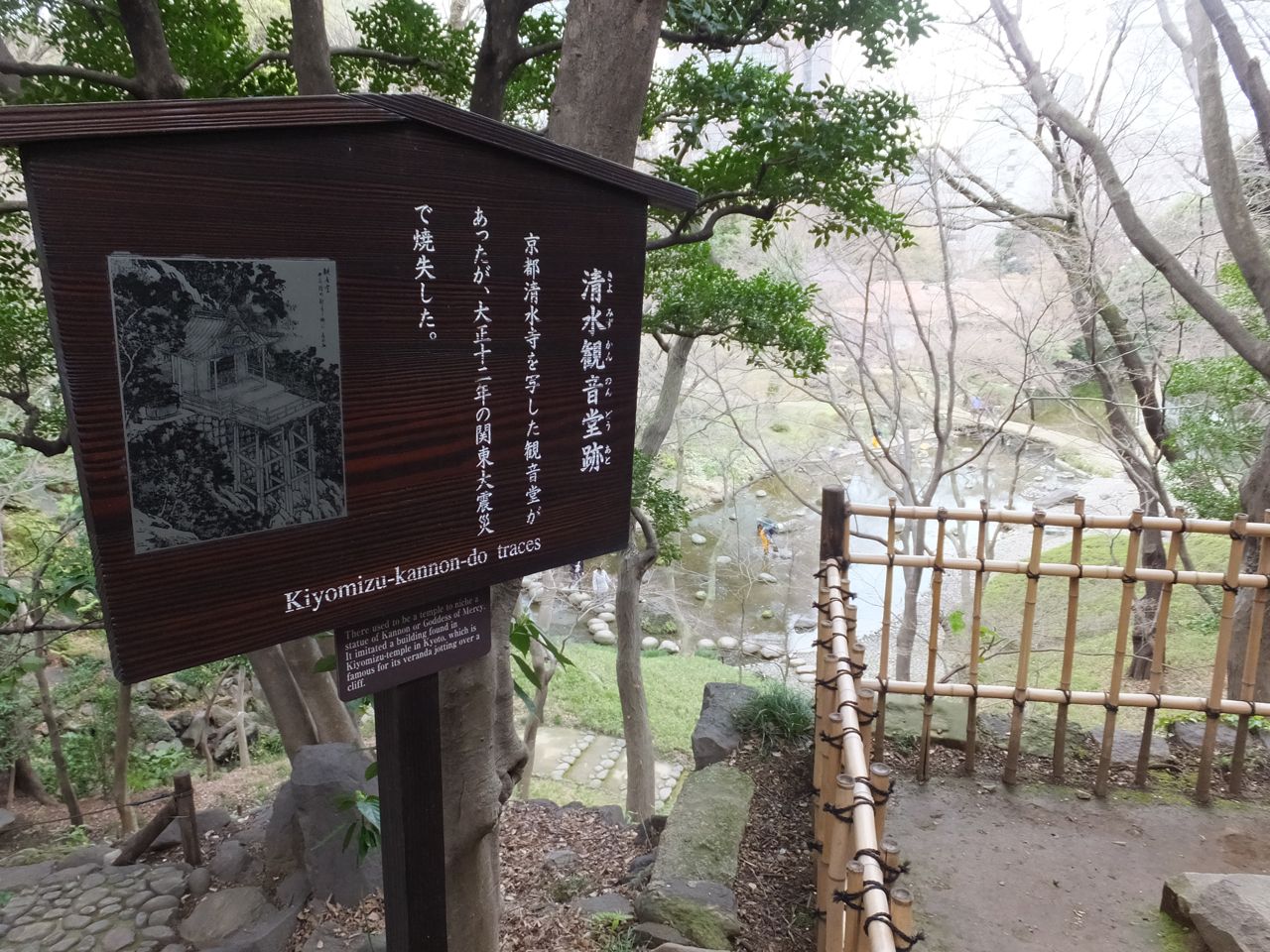 やはり崖の上に張り出しを作ってそこから景色を眺めたい、という欲求は昔からあったのでしょう。最近、日本各地で出現した「・・・テラス」という名所は、最初はやはり京都の清水寺だったのではないかと思います。この清水観音堂もその京都のそれを模したもので、同じ欲求から来ているのでしょう。案内板には昔の存在したときのスケッチが描かれています。現存していればいい展望台になったことでしょう。関東大震災で崩壊、ではなく焼失したのだそうです。何かお茶会でもやっていたのでしょうか?