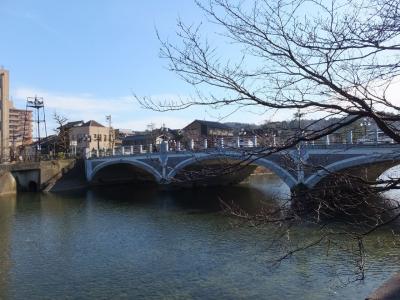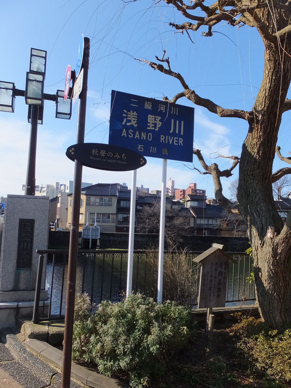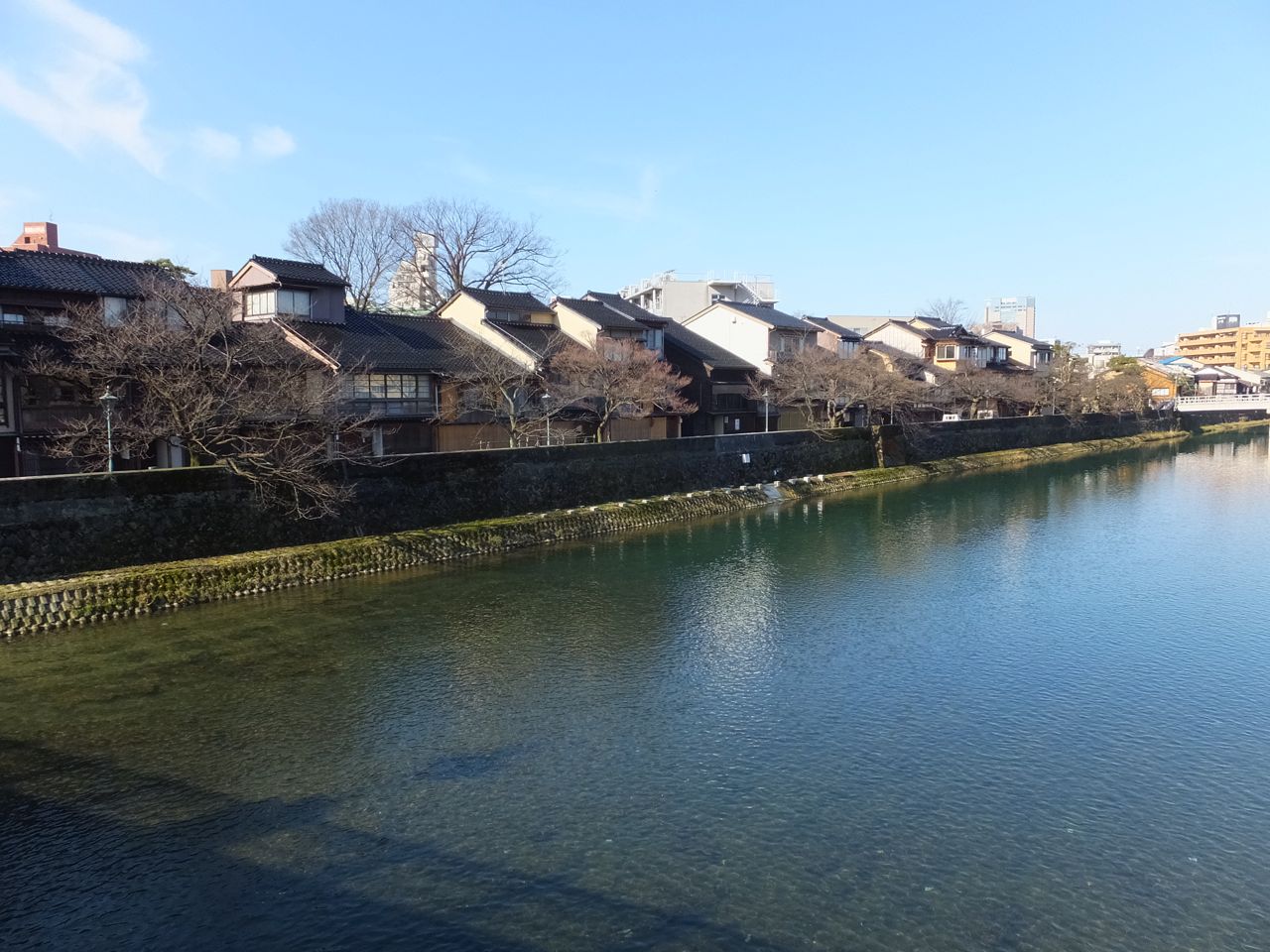 金沢の町は海岸からかなり山に寄った台地の端にできた町なので、川が山から流れ出てすぐのところにあります。なので川が流れがやや速く水量はやや少なくきれいな水です。これがまた風情の演出にとっても役立っている気がします。散歩道が両側にあり、卯辰山をみながら、また、随所にある観光スポットの公園や碑や像をみながら、見応えのある特徴のある橋をみながら、茶屋町を通っての散歩はそれだけでも観光になります。