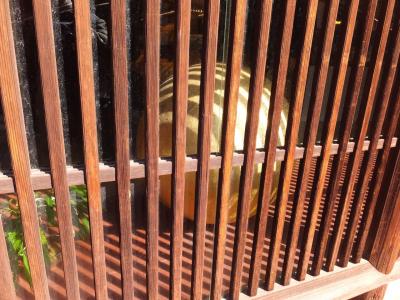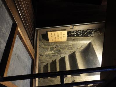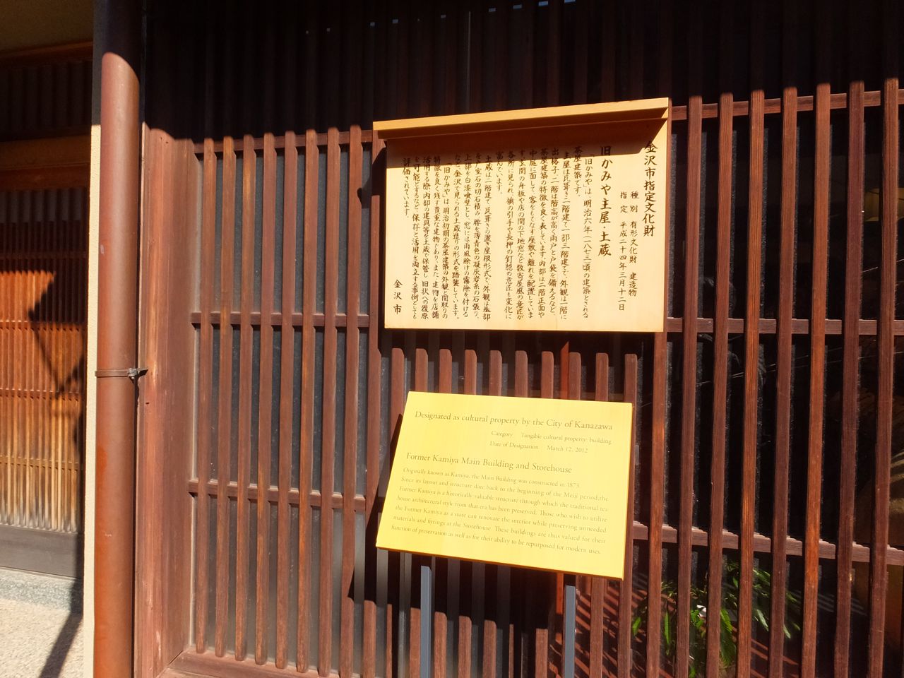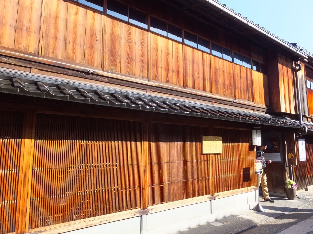 東茶屋街のお店は外観はほとんど同じです。これは統一された街並のためにしかたないことですが、実はちょっとづつ個性はあるようです。この「旧かみや」は明治初期の茶屋建築で、保存のために5年ほどまえに改修し、現在はふすまや障子や戸などは外して土蔵に保存し、店舗として使用しています。茶屋美人、と言う金箔を使用した化粧品のお店です。今は観光地ですが、全部をお茶屋として開放しても何館も見学する人はいないでしょうから、このように店舗として賑わいを出すのはいい方法だと思いました。土蔵は裏面の横道に入ったところです。