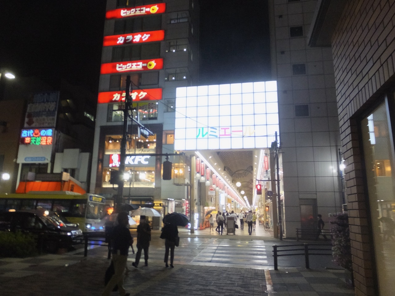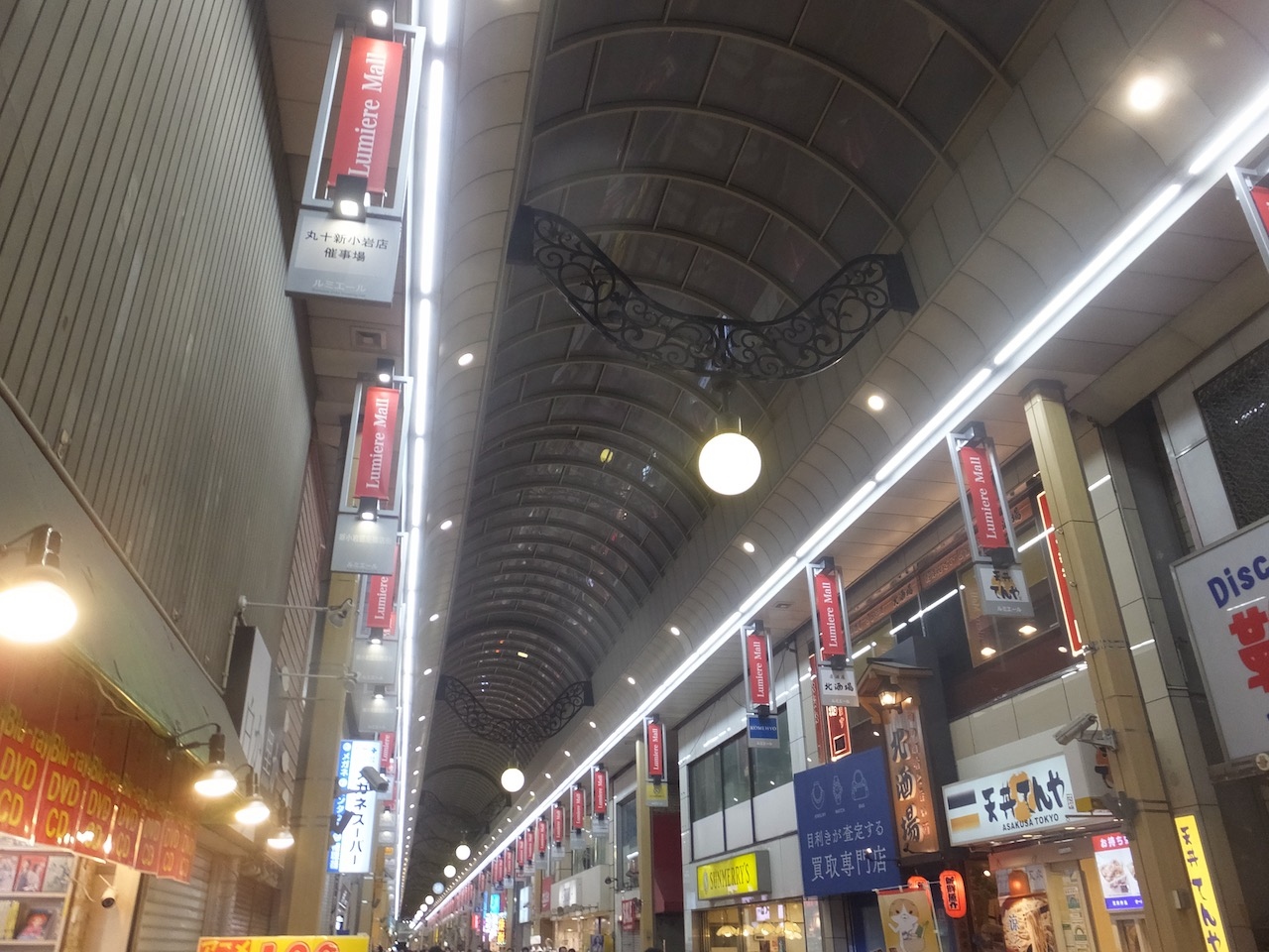 新小岩の南口にあるアーケードの商店街。駅正面のビルの隙間に見える高いアーケードと光輝く大看板が目立っています。「ルミエール」はフランス語で「光」だっんだなあ、と思い出させます。
