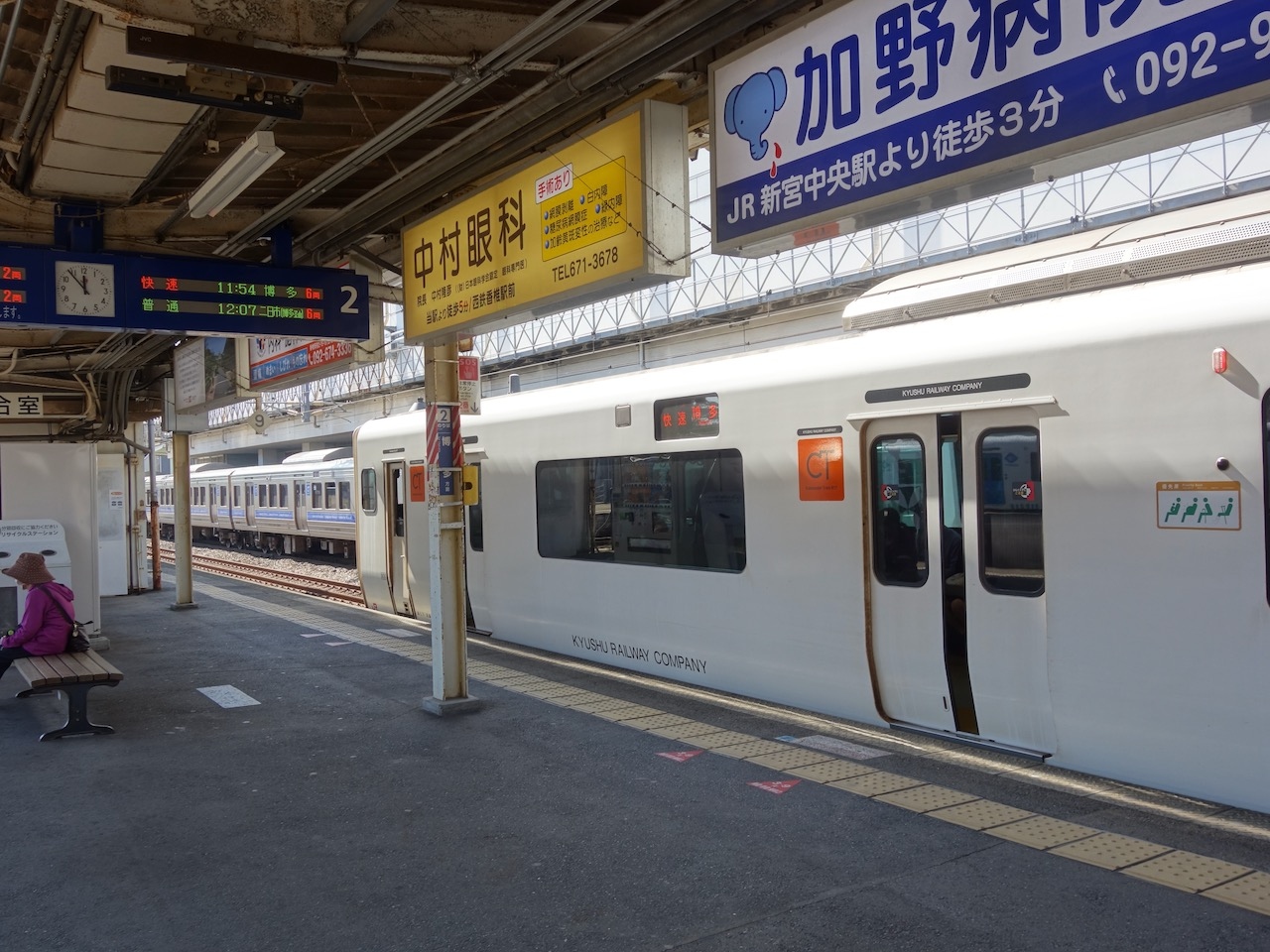 福岡近郊の普通・快速は近年は列車本数も減ってちょっと前まで昼間6本/1時間だった赤間から折尾の間は今は2本/時しかないという。それに快適クロスシートだった車両もドアの両脇の1列を撤去した車両も多く、1両の座席定員がたった24人しかなくて列の2番目でも席にありつけないことも。連結車両数と本数減の結果のラッシュ対応のためですがさすがにちょっと寂しいです。また、窓の高さの低い新車も多く入っています。旅行の際は短距離でも特急を使った方が快適でしょう。