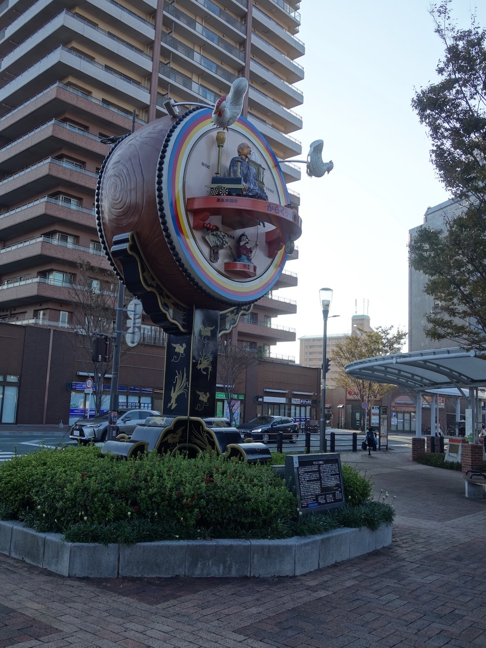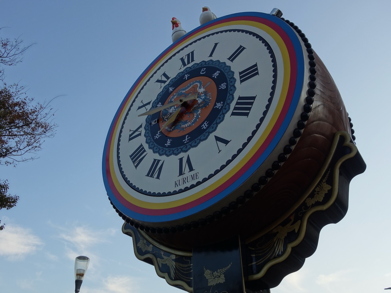 JR久留米駅のバスロータリーの片隅にあります。駅前でからくり太鼓時計は目立ってますがその下あたりです。案外小さいです。