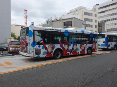 沼津市内では伊豆箱根バスと並んで目に付くバスです。富士急の系列なので昔ながらの緑の濃淡ベースの車両が多いのですが、ラッピングバスもあり、沼津といえばこのアニメというラブライブのラッピングバスがきました。ららぽーととのこれぼのようでした。このあにめ、沼津のまちおこしに使っているのでバスも当然そうなるわけですね。