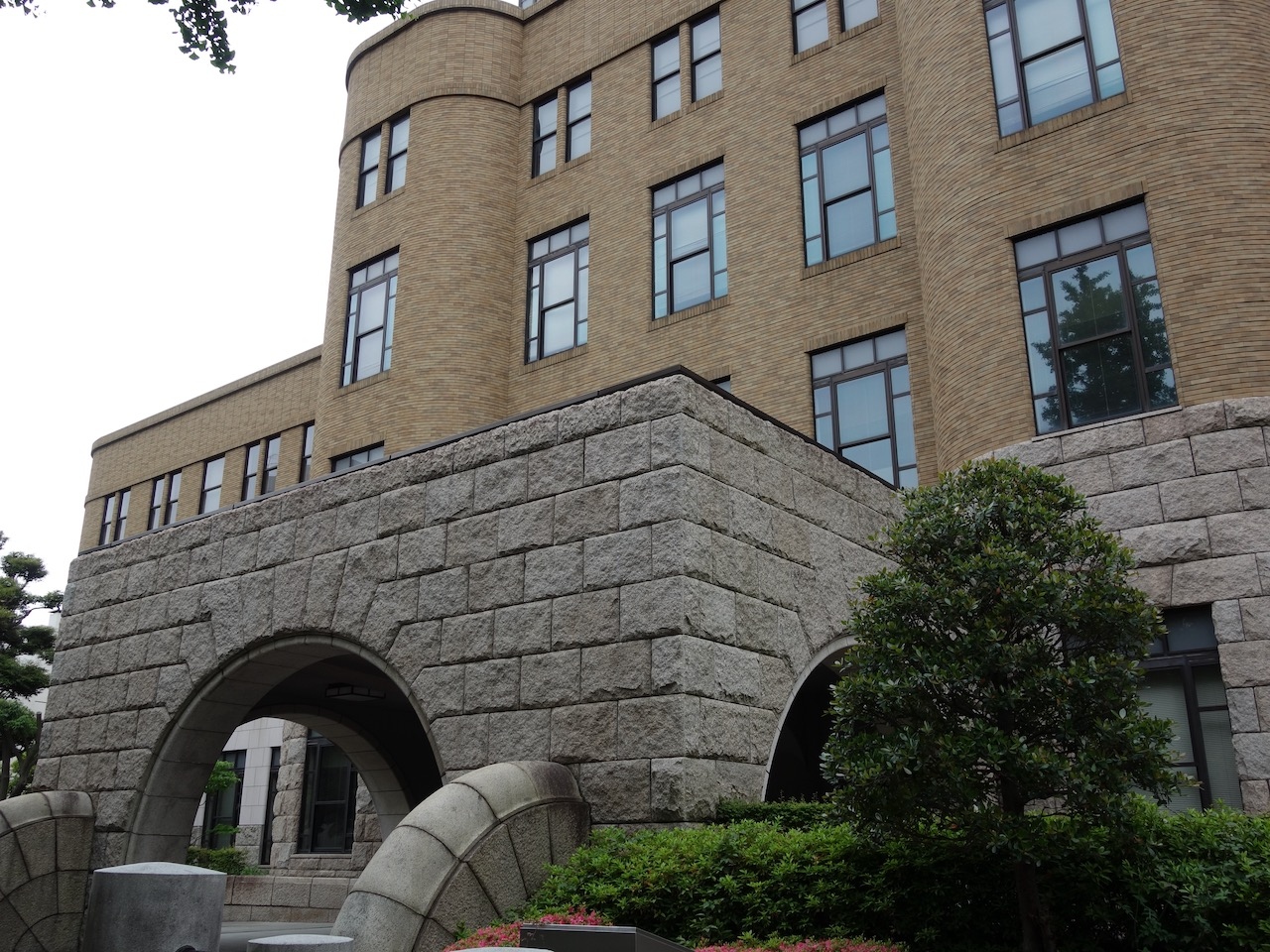 日本大通りにある旧い大型のレトロなビル。正面の石造りのアーチが重量感たっぷりで後のビルの茶色タイルの壁の存在感が軽くなってしまうくらい。正面から見ると分割された窓枠の大窓も存在感があります。