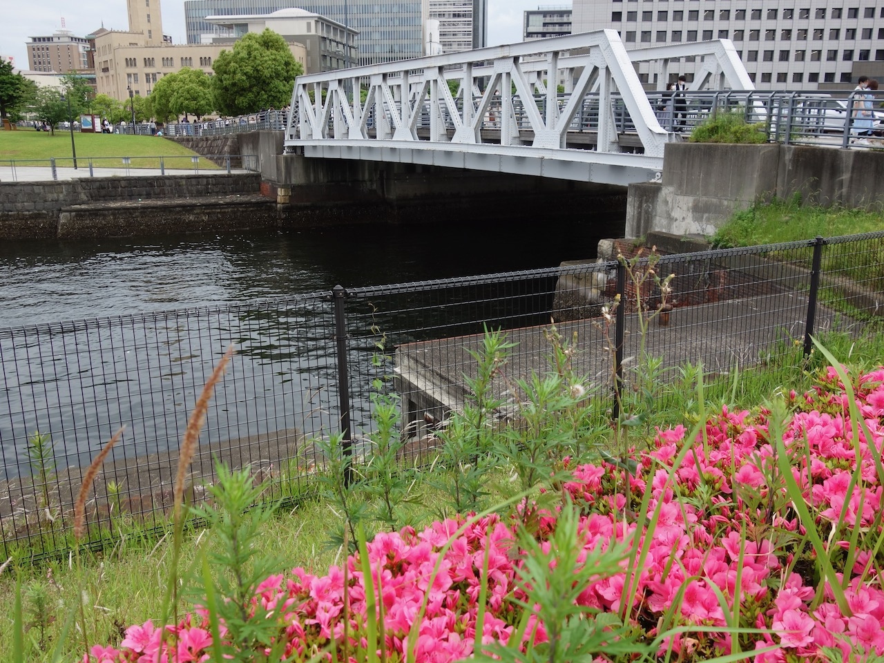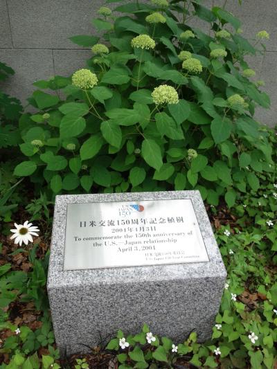 大さん橋の入り口の開港広場公園の奥の壁際に開港百五十年を記念して植えられた記念樹です。開港は1854年なので2004年に植えられたということで、まだ20年くらいです。ハナミズキが流行しかけたころの植樹なのですが、あまり大きくならない樹でもあるので、いつまでも楽しめそうです。春から初夏が見頃です。なお、根本にはあじさいらしき樹がみえました。花の共演がみられそうです。