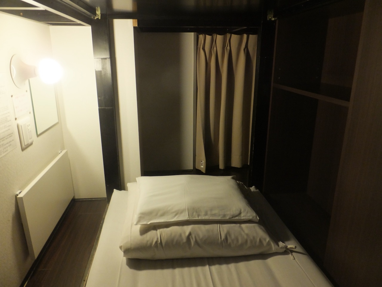 宿泊したのは1階の4人部屋の下段で荷物も置けるスペースがあるなど広々。入ってしまえば隔絶された世界でゆっくり寝られました。シャワーは歩いて2歩。でも近所に銭湯があるのでそれもおすすめです。