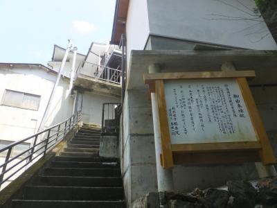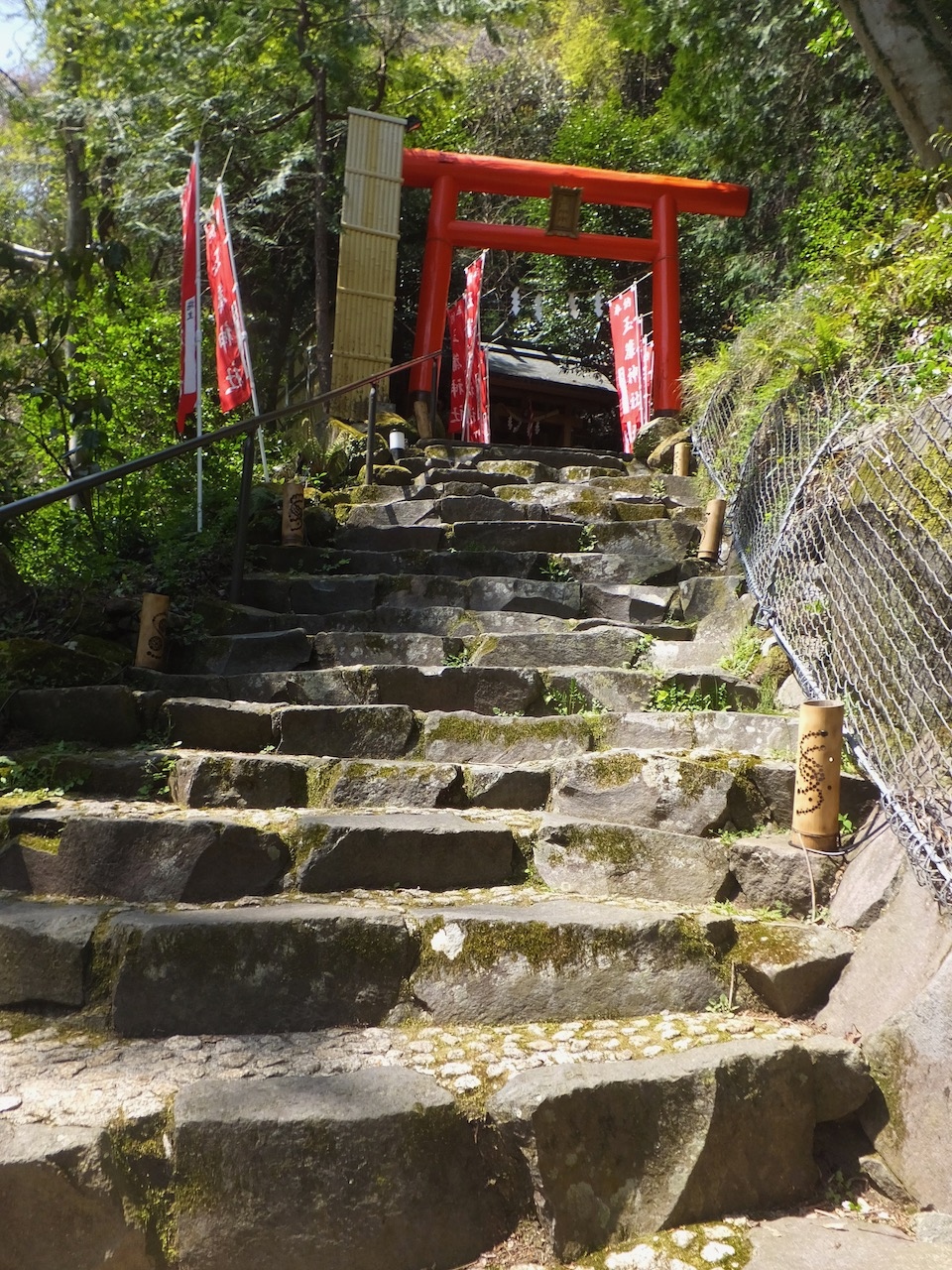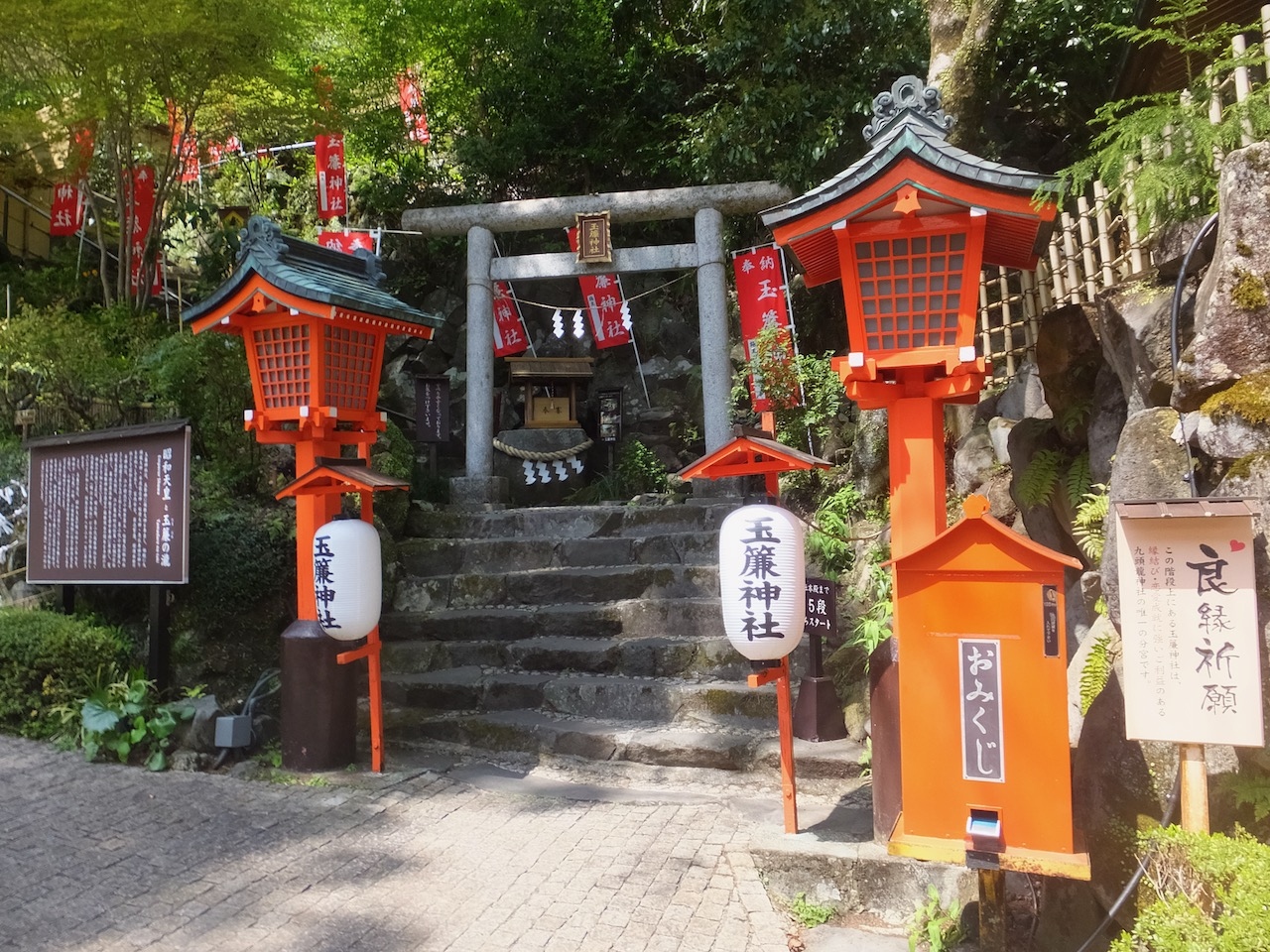 天成園というホテルの中庭にある神社です。飛烟の瀧・玉簾の瀧をメインにした散歩道があり、そのスポットのひとつとしてこの神社があります。しかし、100段近い階段の上で、真夏はけっこうきついと思います。竹の筒が置いてあるのでたぶん、夜は足元灯になるのだと思います。宿泊客だけ味わえるロマンチック、ですね。