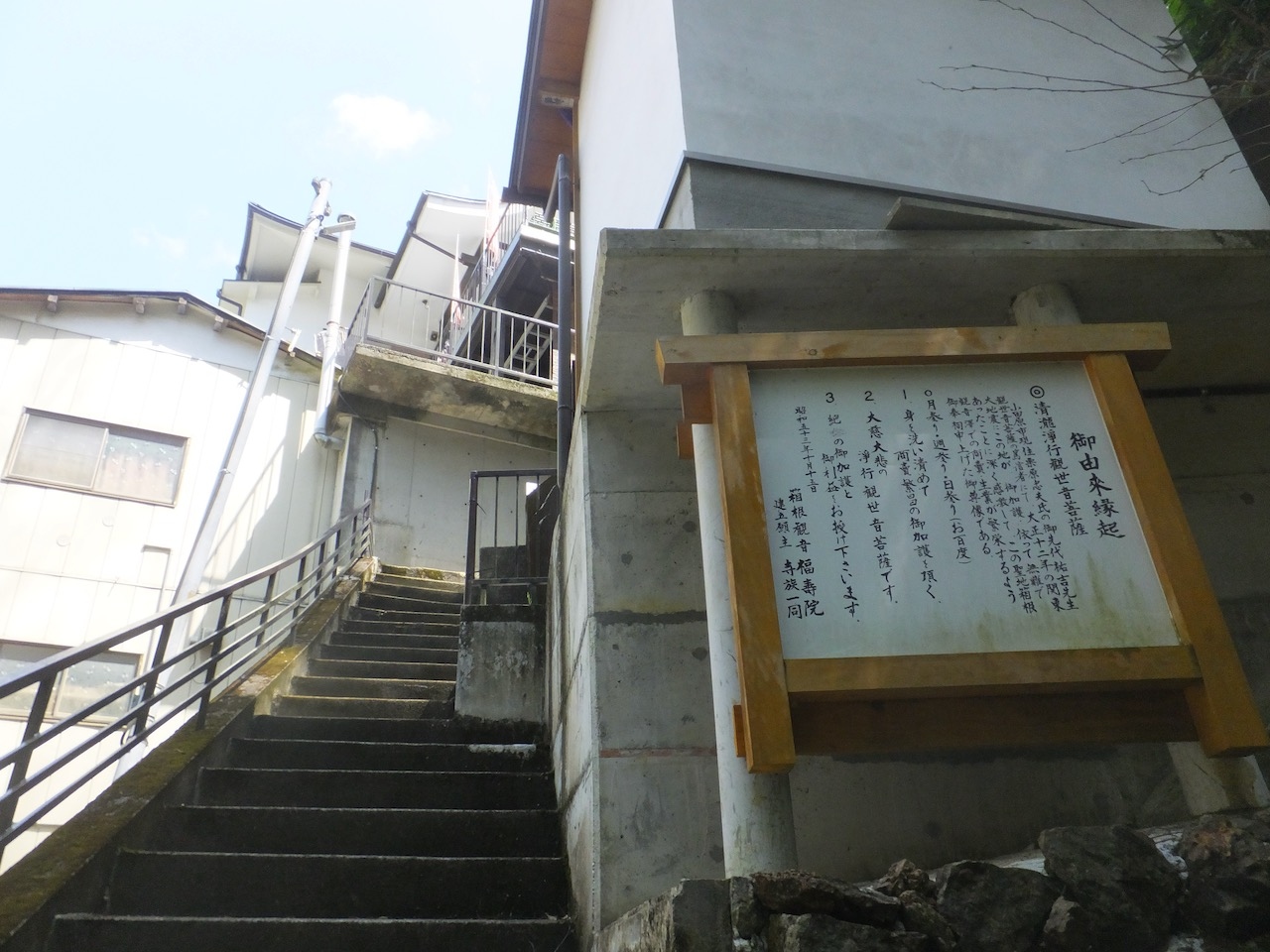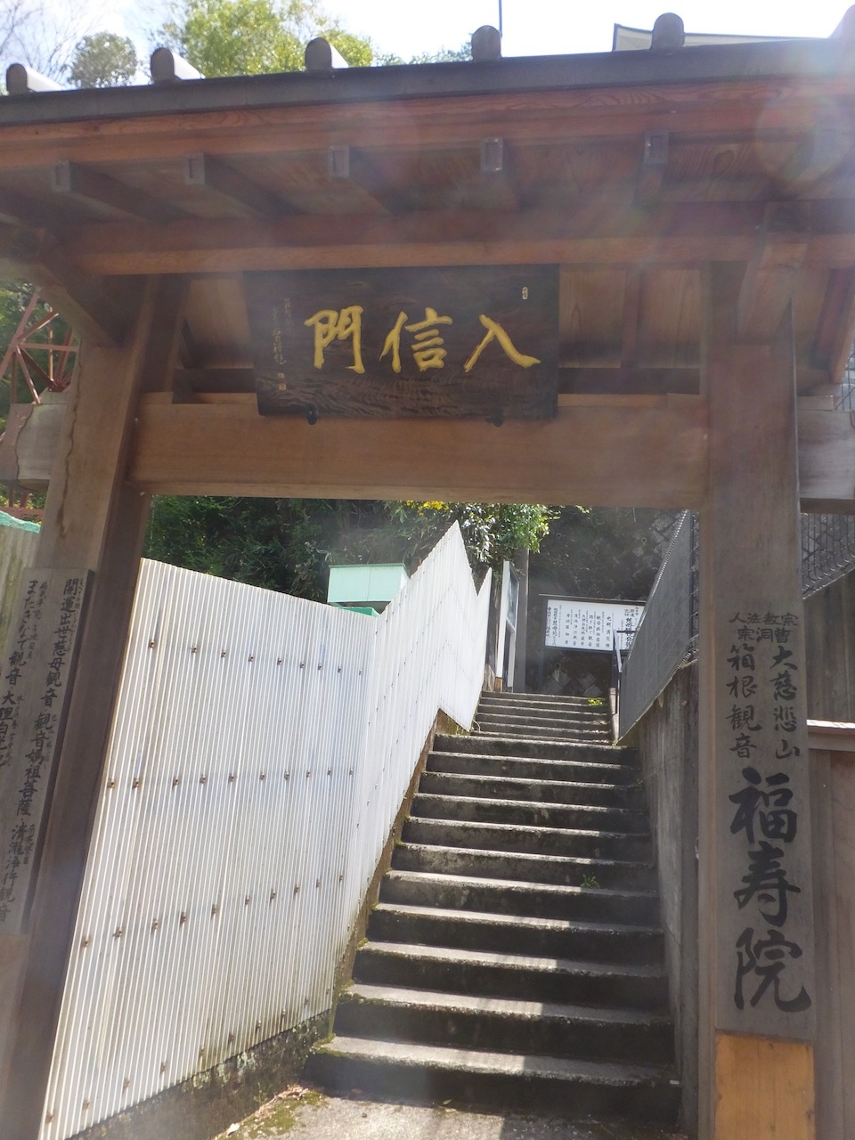 箱根湯本の街歩きです。散歩マップでは、須雲川沿いに遡って、この箱根観音で山側に登り、旧東海道の石畳を駅に戻るコースになっていました。なので、かなり登ります。それも長い階段で何回も折り返します。登り切ったときには湯本の温泉がはるか下に。跨ってお祈りするおもしろい観音さまがありました。子宝・夫婦円満にいいそうです。