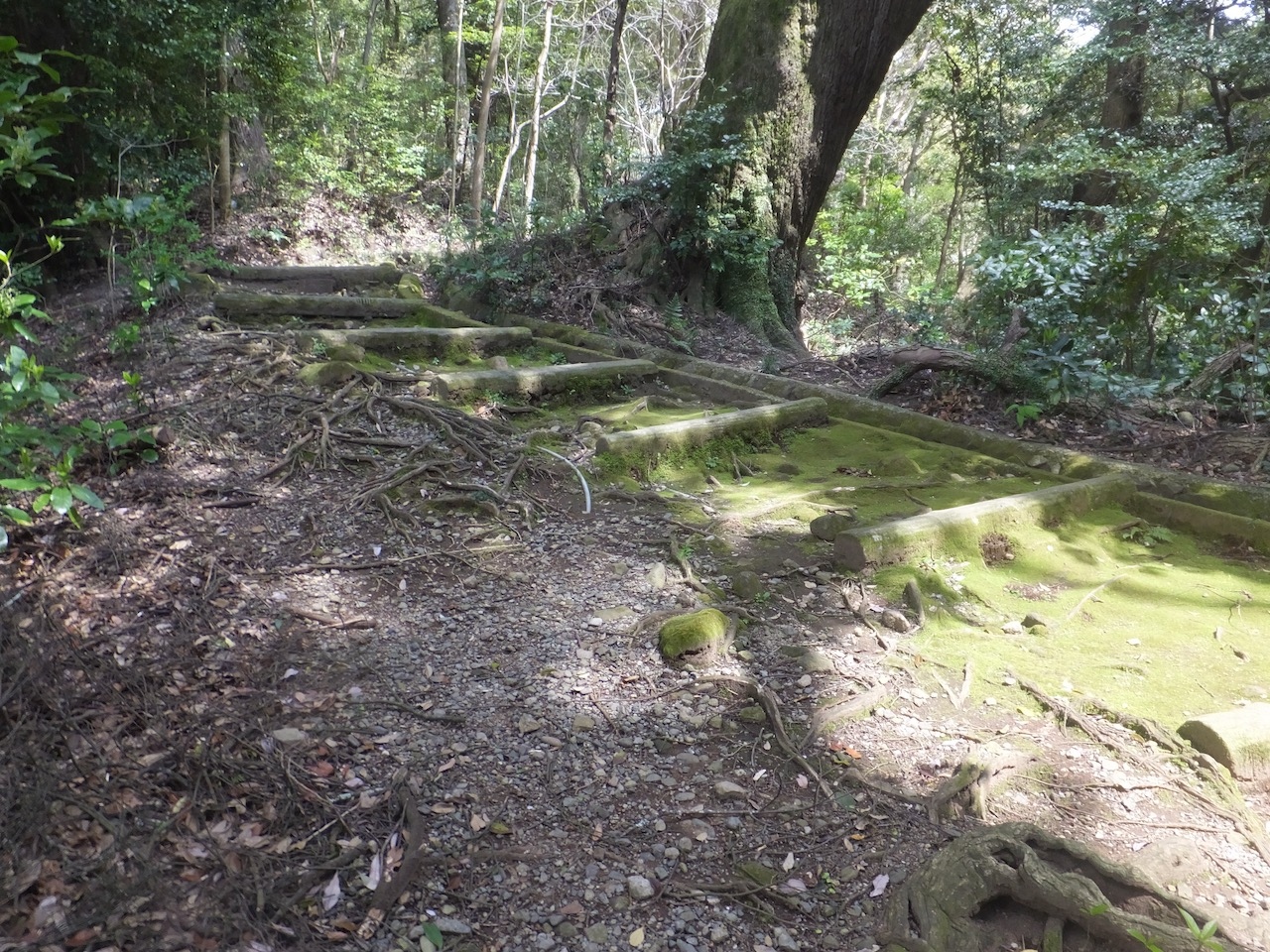 丸太の階段もある普通の散歩道で、自然林の中を歩くのは気持ちはいいですが、その先は早川沿いの温泉街までの急な階段です。どちらかというと開発しにくかった場所が自然林で残った感じで、散歩以外にはとくに見るものはないようでした。- 旅行時期