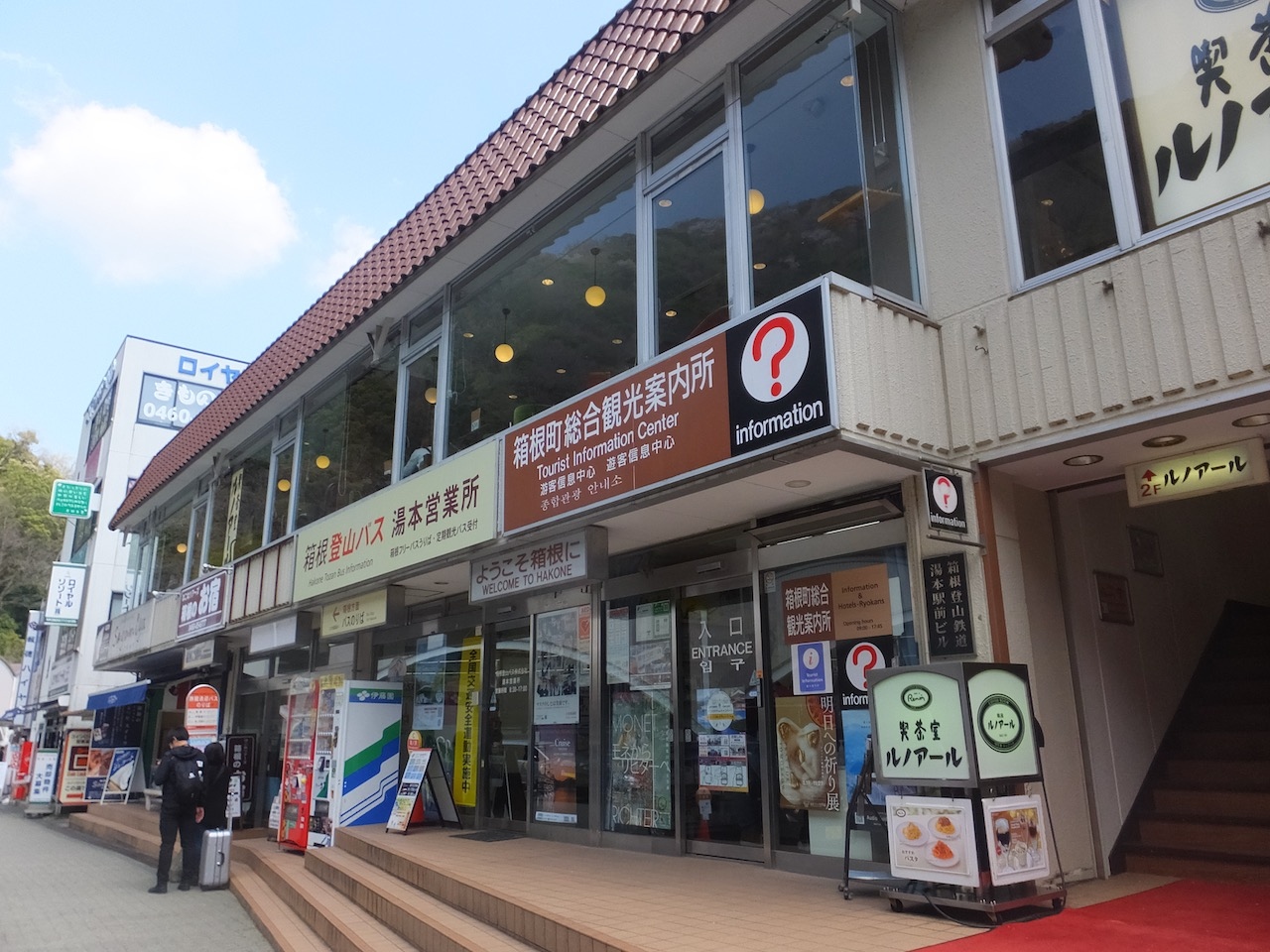 箱根町の観光案内は箱根湯本駅の中ではなく、駅から歩道橋を渡った向こう側の温泉地に向かうバスのりばの建物の一番手前にあります。駅から見えてわかりやすいですし、駅で聞いてからバス乗り場へ、というと時間のロスなので、この場所で正解だと思います。あまり広くはないですがお客さんは多かったです。私自身はバスではなく徒歩観光なので、地図メインの必要なパンフだけいただきました。湯本の温泉街の街歩きのパンフは2回の箱根湯本旅行でたいへん重宝しました。