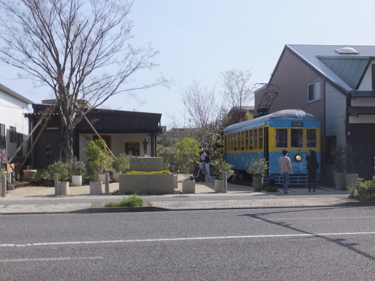 大きく目立つのが路面電車。なんと前照灯や車内灯が点灯状態です。屋外の静態保存車としてはとても珍しいと思います。広場はお店が少し。屋外でも食べられてあたたかな日だったので楽しそうでした。なお、二宮尊徳(金次郎)の例の銅像もあります。が、路面電車に注目度で負けている気がします。