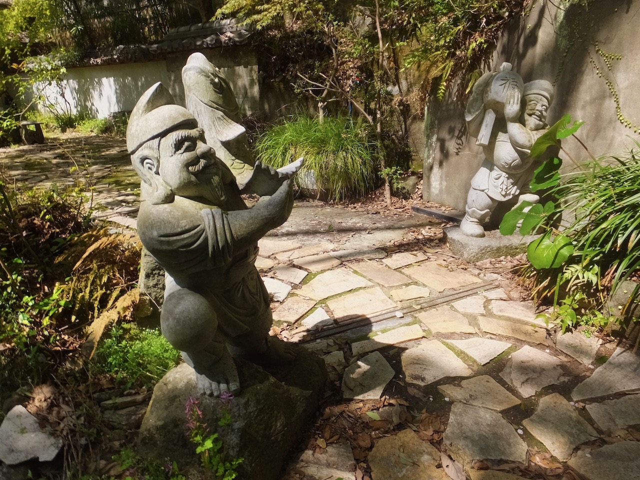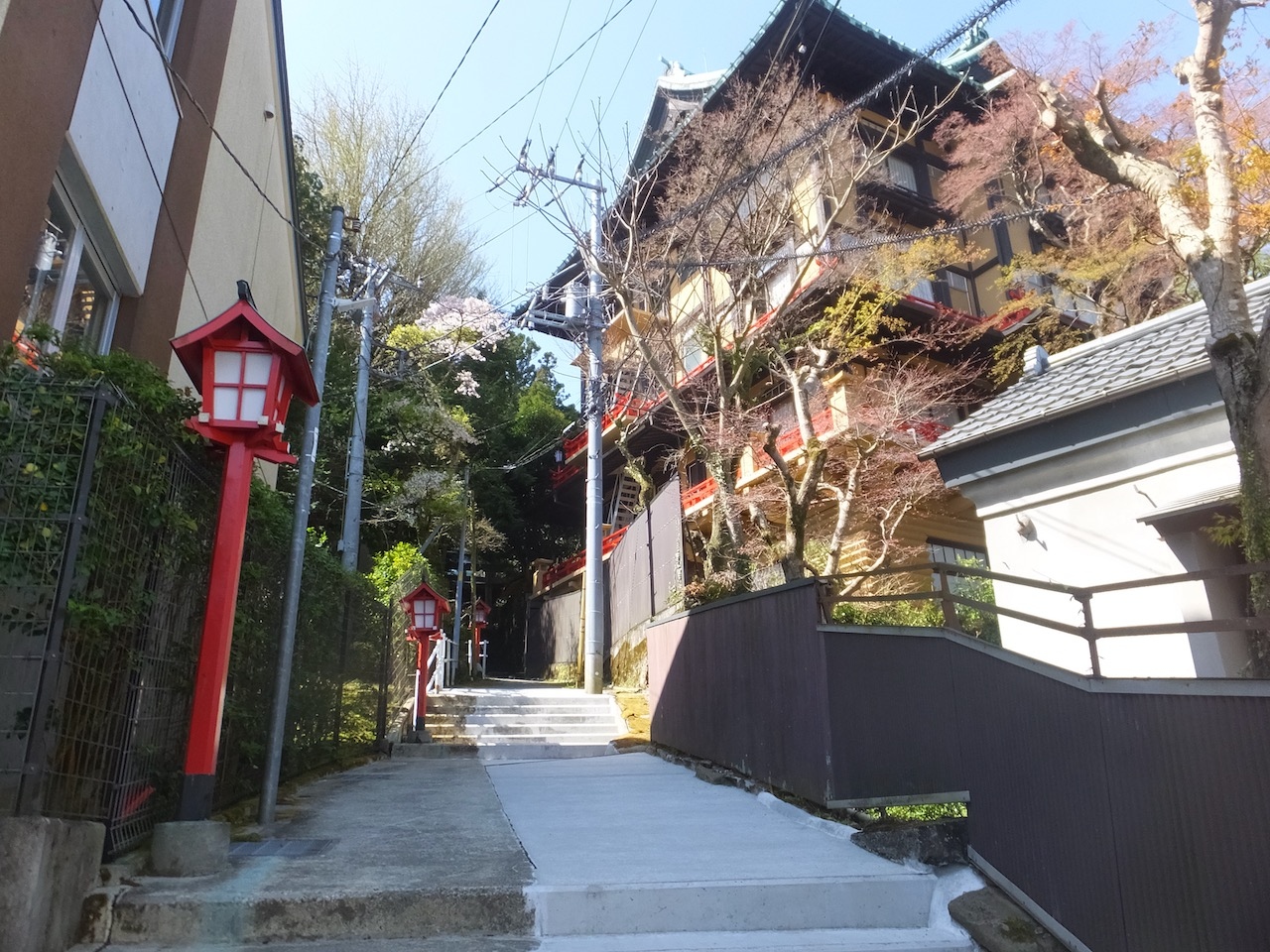 ホテルの横の坂道と階段を上り詰めた場所にひっそりとあります。苔むした石柱など森の中を感じさせます。