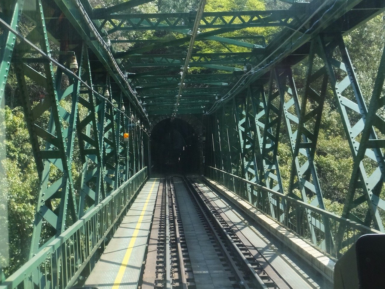 この橋を感じるには、先頭車か最後尾に乗って走行シーンを見るのがいいでしょう。天地が低く、まるで箱の中を走っているかのような感覚を味わえます。
