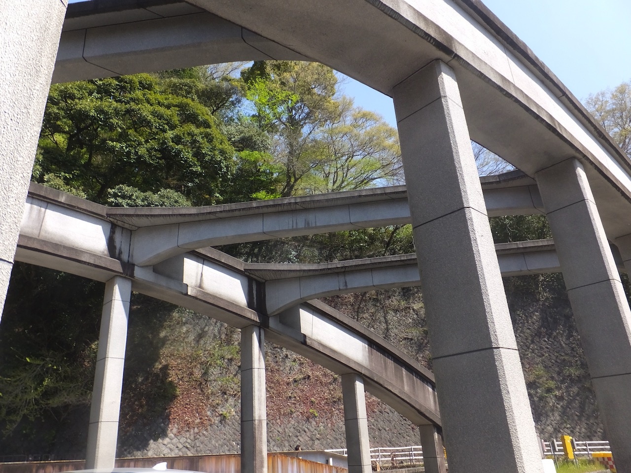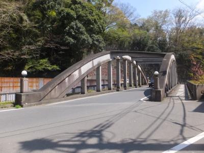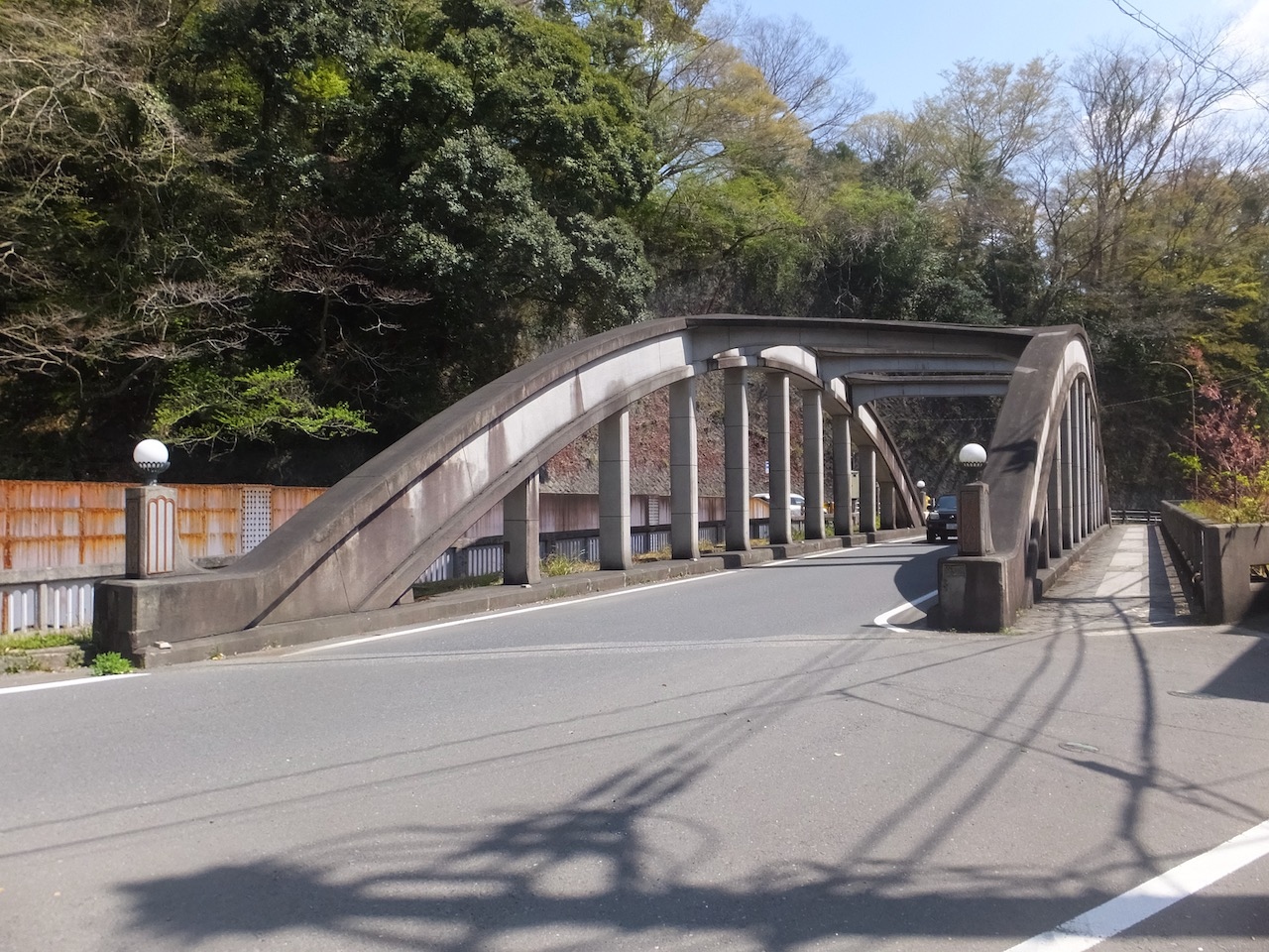 箱根湯本の温泉街の山側の端にある橋です。国道は上下2車線ですが、山に登る側の車線がコンクリートアーチ橋、山を下る車線は普通の橋です。もちろん価値があるのはコンクリートアーチ橋。昭和初期のもので、今も現役。川を斜めに渉のでアーチも左右でずれてます。それを結ぶ天井の桁が斜めになっているのがおもしろいです。
