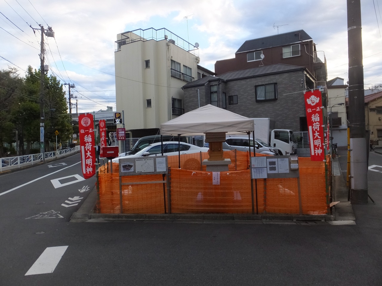 久しぶりに訪問してみると建て替え工事中で、後の方はコインパーキングになって、手前にコンパクトなお社がつくられるようで、計画図も表示されてました。神棚のような小さなものが置かれてました。テントの屋根があるので屋内用のものではないかと思います。歴史のある神社だけに完成が楽しみです。- 旅行時期