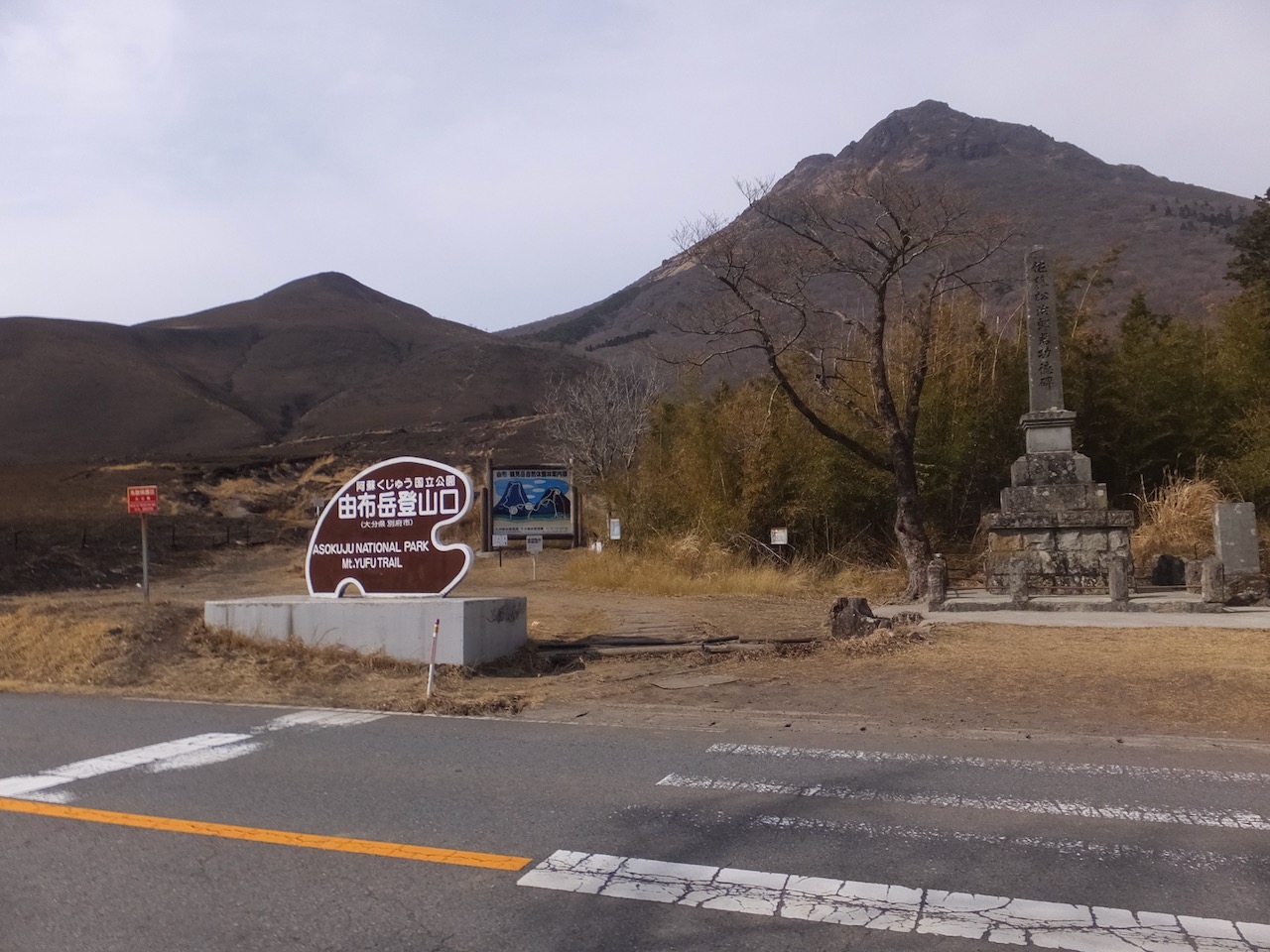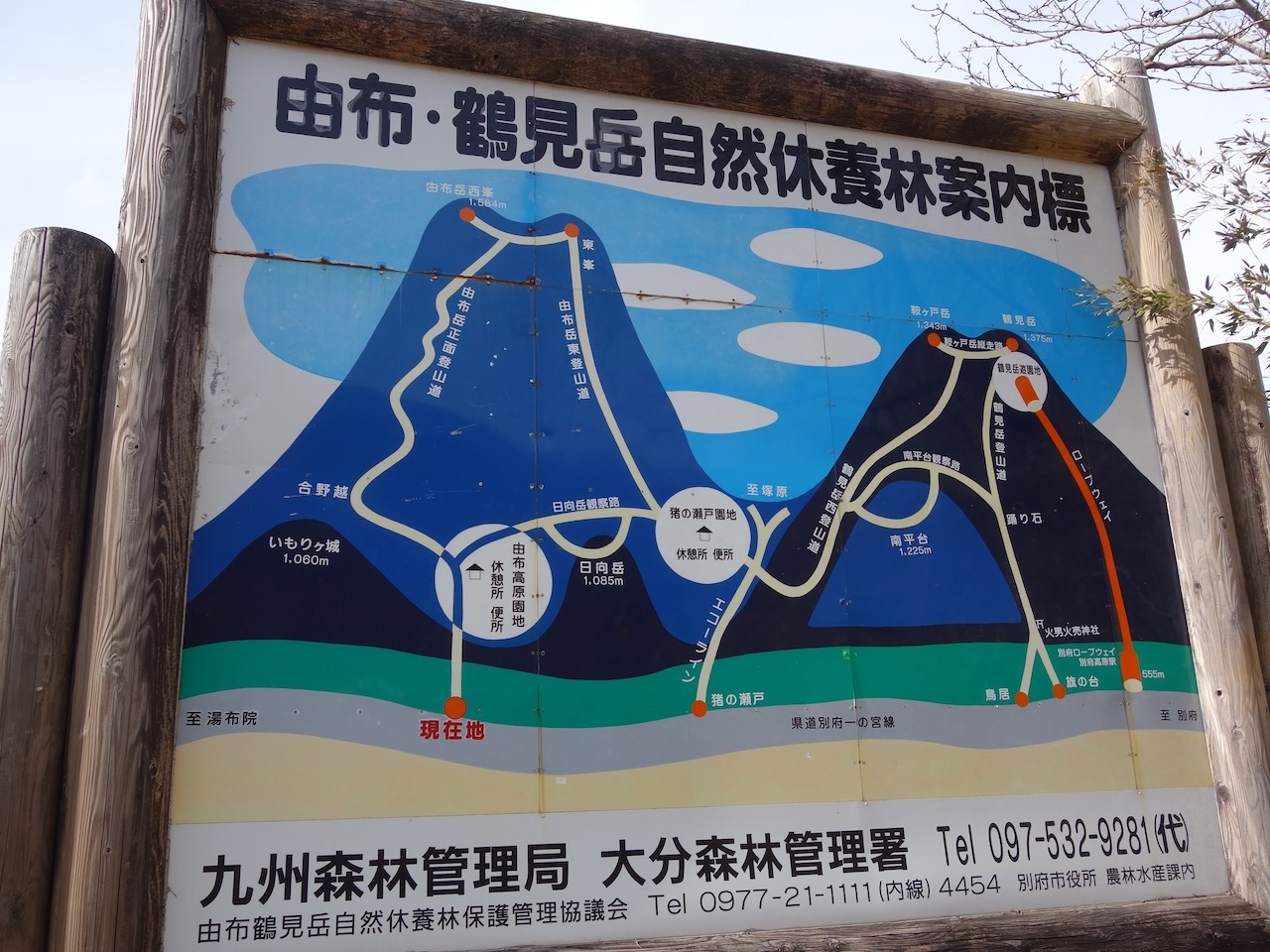 由布岳登山口に車を停めると由布岳登山の案内と、この由布・鶴見岳自然休養林の案内板があります。