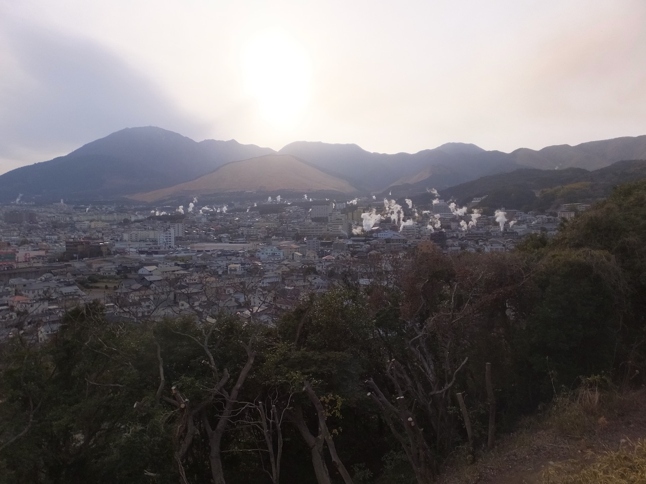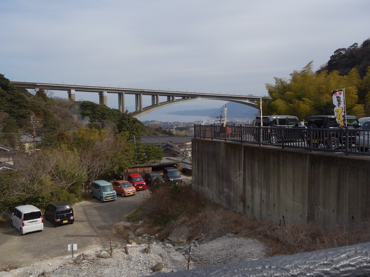 車の場合は別府でぜひとも行っておきたい場所です。別府の温泉を一望できます。お湯の煙がいたるところから出ています。ただ、ここは住宅街の中。道は細く、曲がりくねり、小さな案内板が頼り。駐車場も台数は少なく、たまたま空いていたのですが、黄昏時や夜景鑑賞のときは満車もあるかも。
