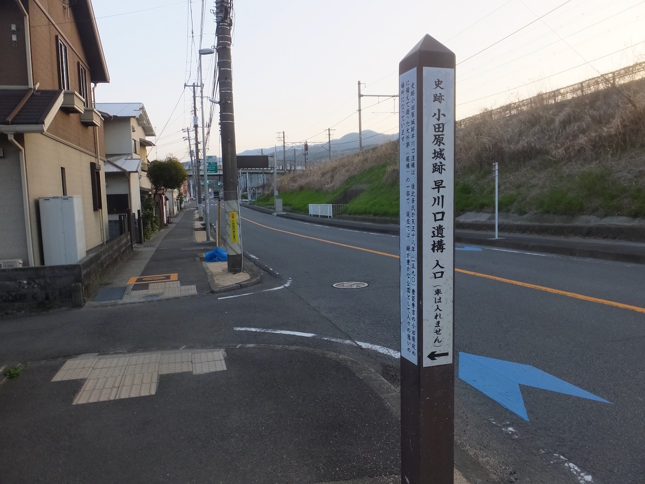 小田原駅から早川駅までの中間くらい、小田原城のトンネルを抜けた先、早川の鉄橋の手前の南側、住宅街の中にあります。入り口の小さな標柱をみおとさぬよう。2ヶ所入り口の案内がありますが、西側の方が近いので簡単に遺構にたどりつけます。