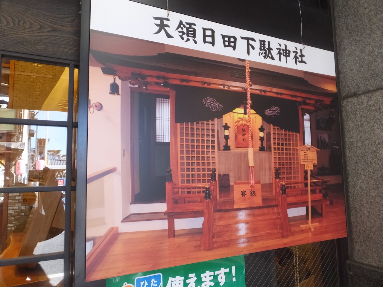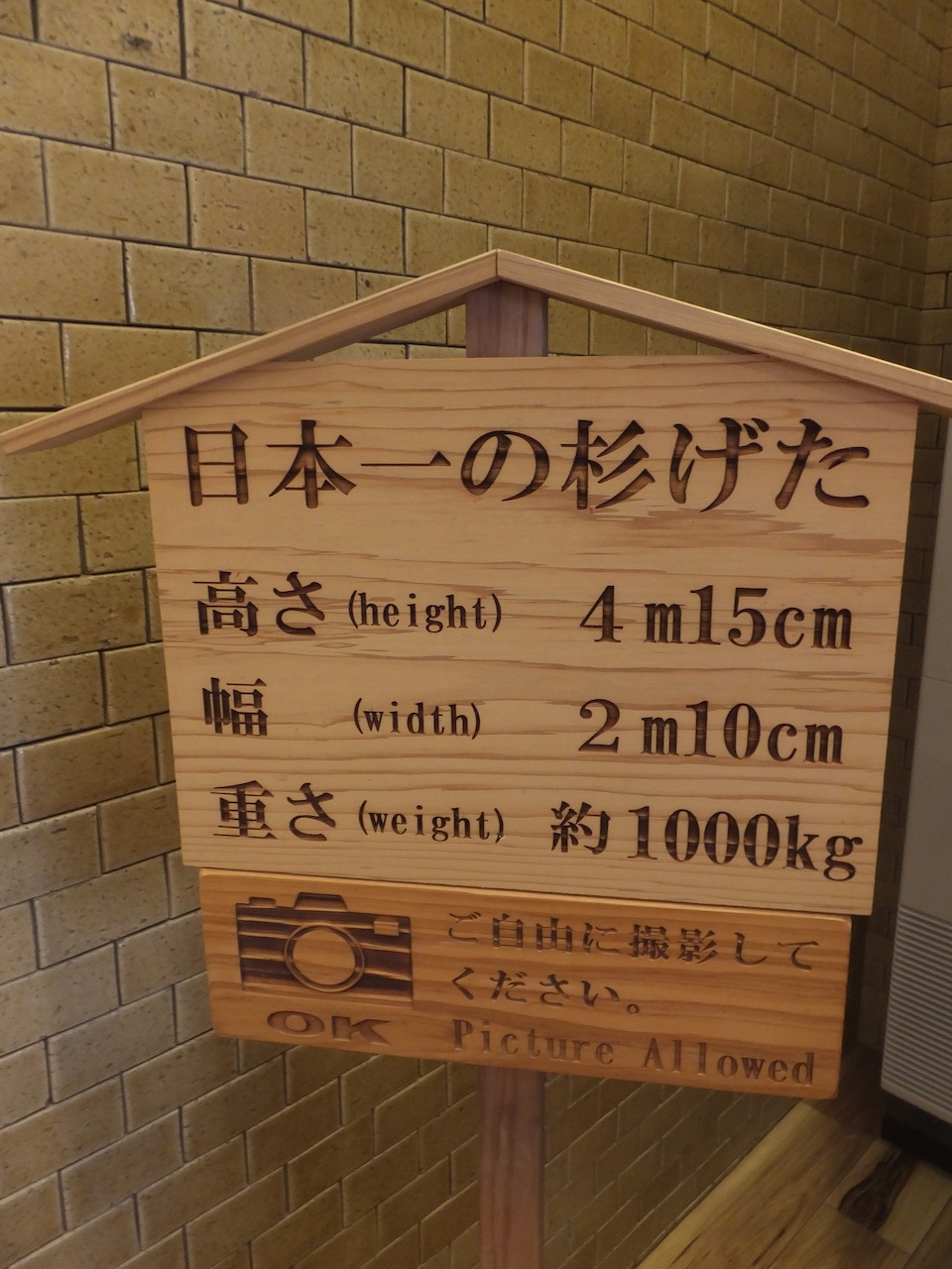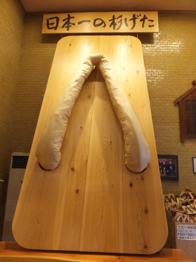 豆田町の東側の大通り、上町通りの南の方にあります。下駄屋さんの建物の中に「日田創作和紙人形会館」と「日田はきもの資料館」が同居しています。圧倒的に存在感があるのが後者で、なんと日本一のスギの下駄があります。なんと高さ4m15センチ、重さ1トン。動かすのも大変そうです。並んで写真を撮ることもできます。ここはぜひとも人物を対比のために入れてみましょう。
