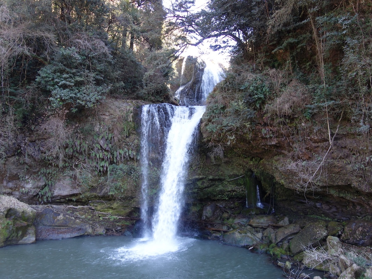 九大本線からもちらりと見えるので有名な2段の大滝です。「道の駅 慈恩の滝 くす」から歩いていけます。そのため車が便利です。上段は岩を這うように、下段は一気に滝壺へ、と雰囲気の違う2段でこれはけっこう珍しいと思います。