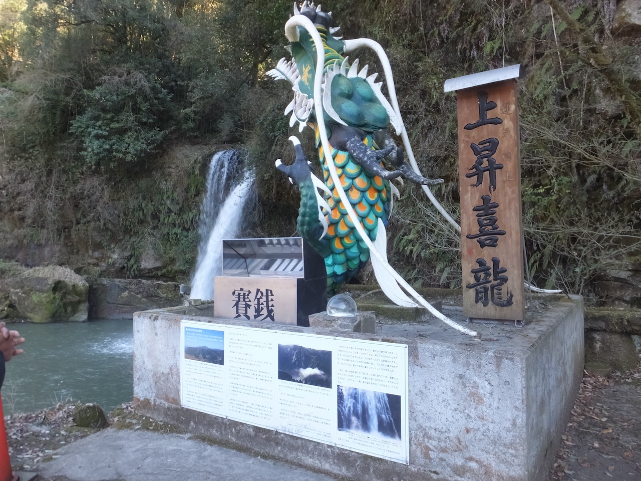 滝壺の脇に「上昇喜龍」の像があり、お賽銭を入れるようになっていました。神社の鳥居でもあれば、ですが、あまりみな関心はなさそうでした。- 旅行時期