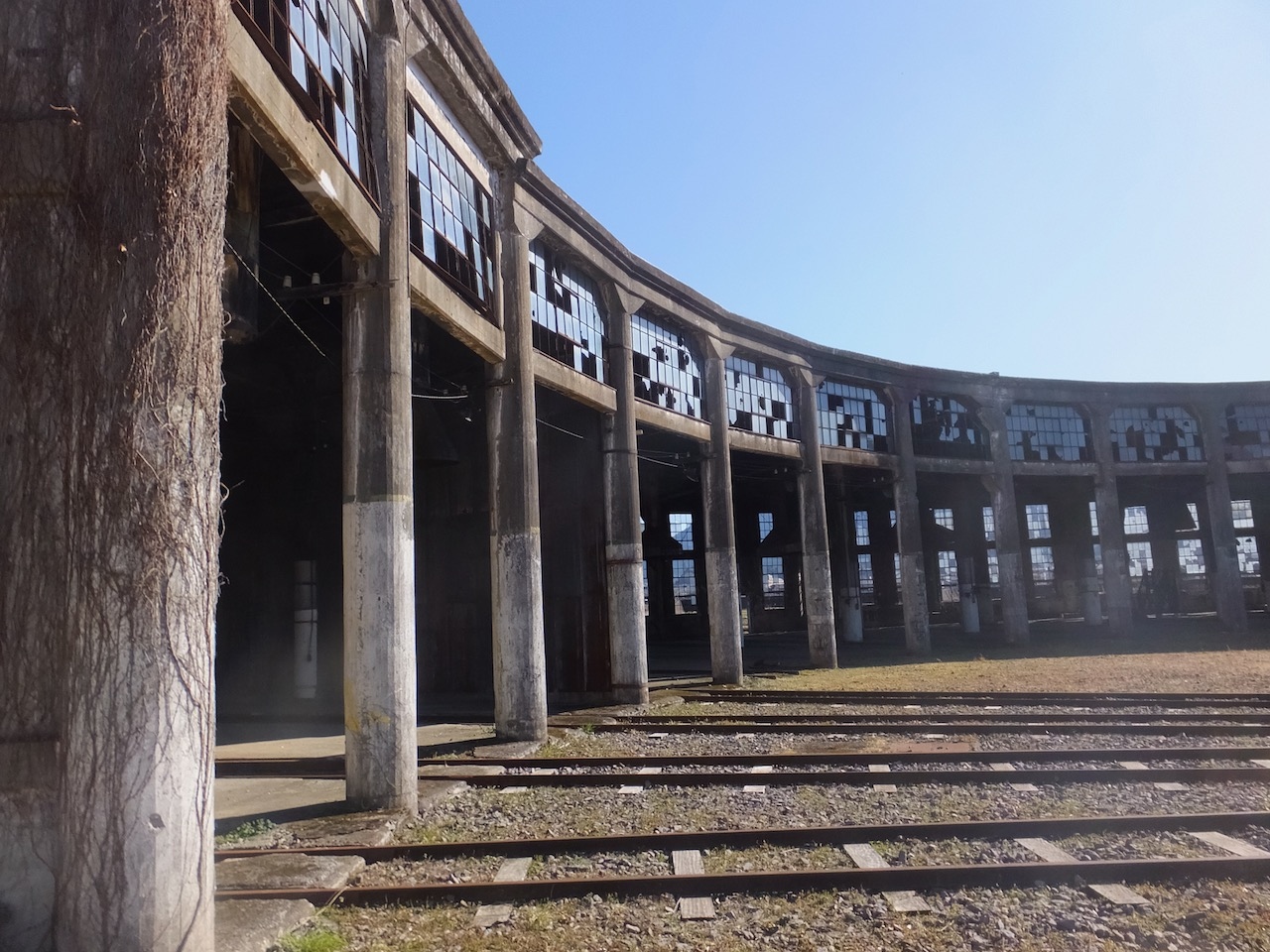 豊後森駅の横に使わなくなって久しい転車台と扇型機関庫があるんは知っていましたが、まさか保存展示に移行すうrとは思いませんでした。しかも機関庫はガラスが割れ、蔦がからまった外観のまま。