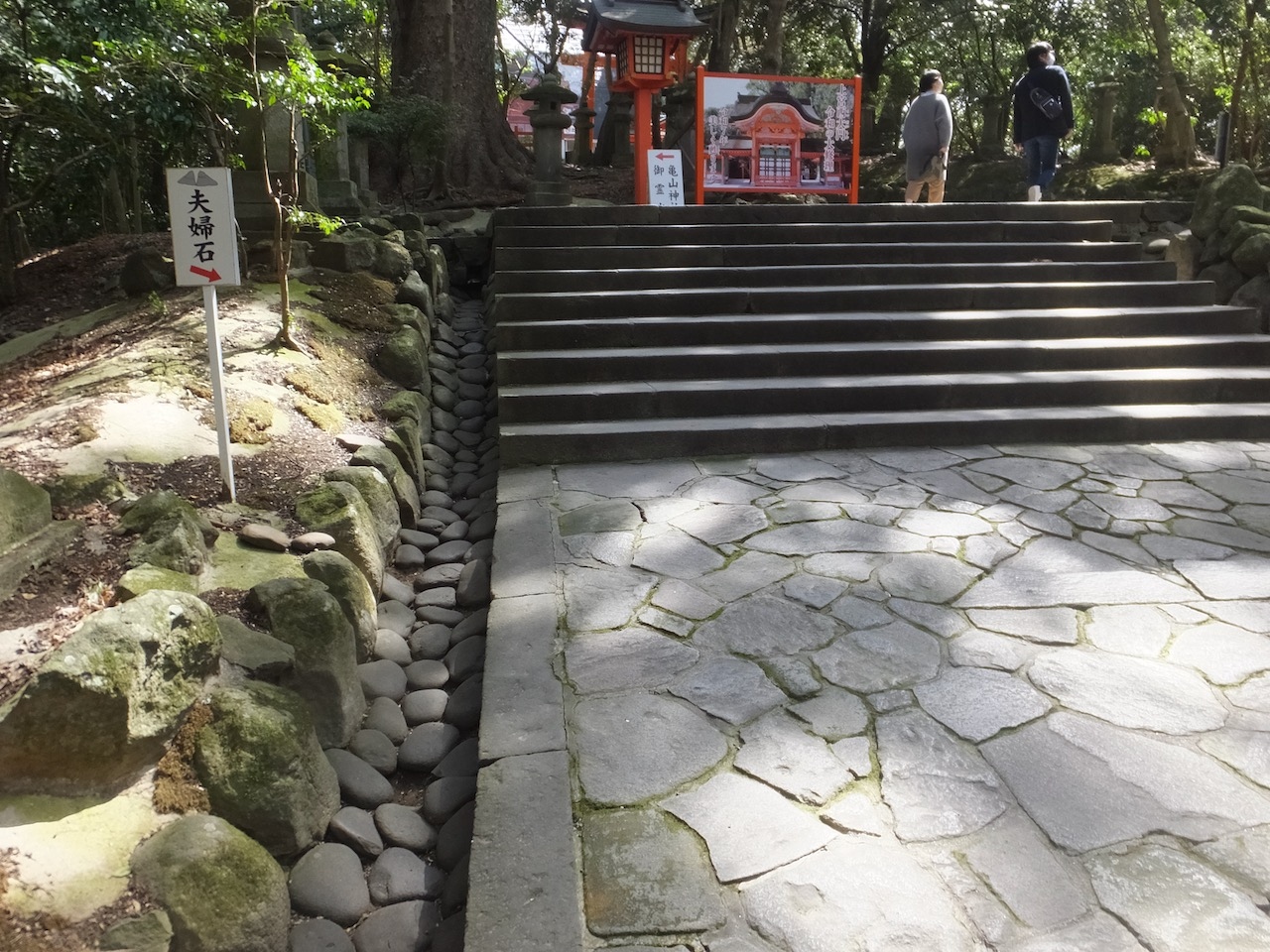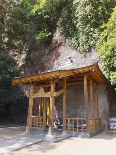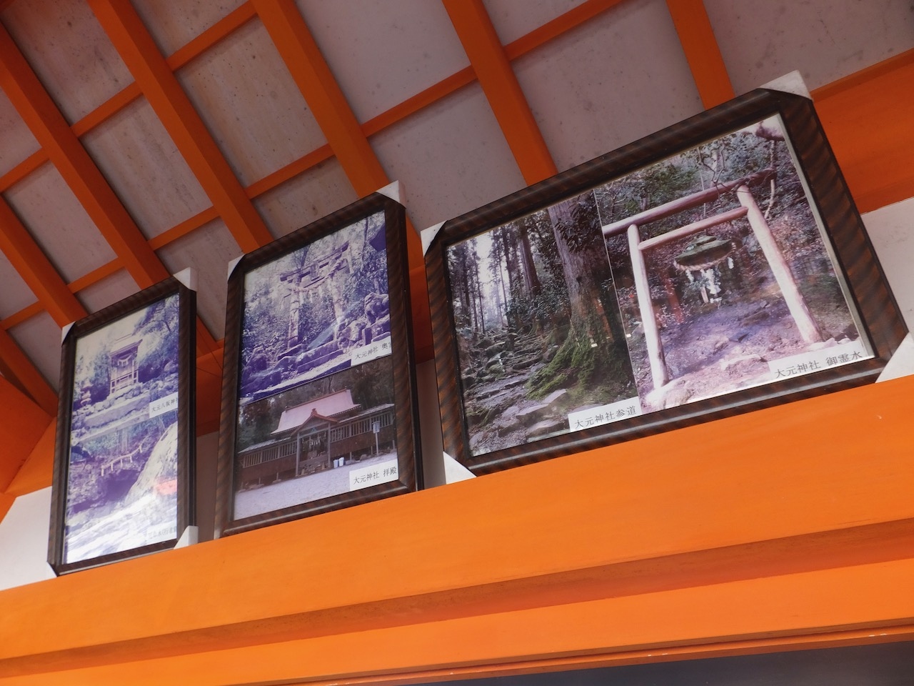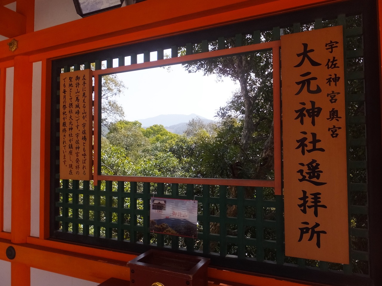 宇佐神宮の上宮のお社の反対側の壁に空間が開いていて、それがこの遥拝所。遥か彼方の山の上に、この宇佐神宮発祥の地があり、そこにある「大元神社」をここからお参りするのです。案内板があって、この山、と写真があるので、どの山かは間違えないですみます。高台にある宇佐神宮なので見通しは良く、お参りした気分になれました。