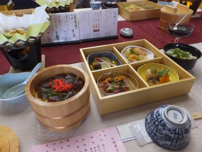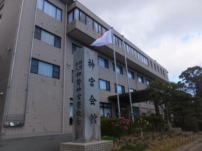 おかげ横丁のちょうど裏側、国道沿いにあるホテル・大講堂・弓道場・相撲場などの総合施設。ホテルはごく一部、でした。国道に面した建物の上階のレストランで昼食。揚げ物・煮もの・焼き物の上にウニ鍋という豪華さ。そして伊勢名物の手こね寿司にくわえ伊勢うどんも。素晴らしかったです。