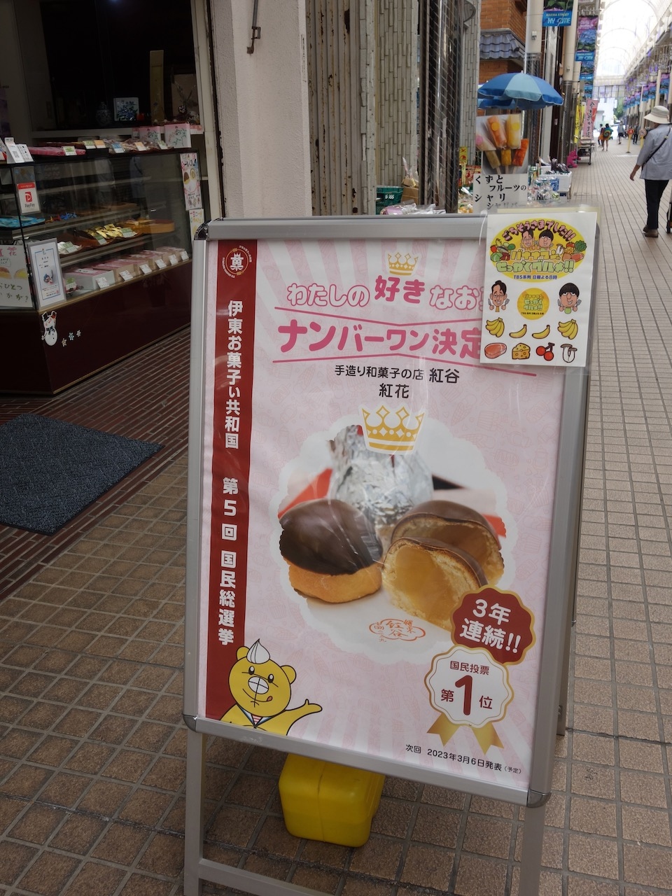 伊東温泉の街歩きで、アーケード街の店先に立て看板が。お菓子の宣伝。お菓子「い」共和国の投票でナンバーワンのお菓子、って何?と吸い寄せられました。栗まるごと入り白餡が入った丸いクッキー。チョコがけ。これで160円。素晴らしいコストパフォーマンス。美味しくいただきました。