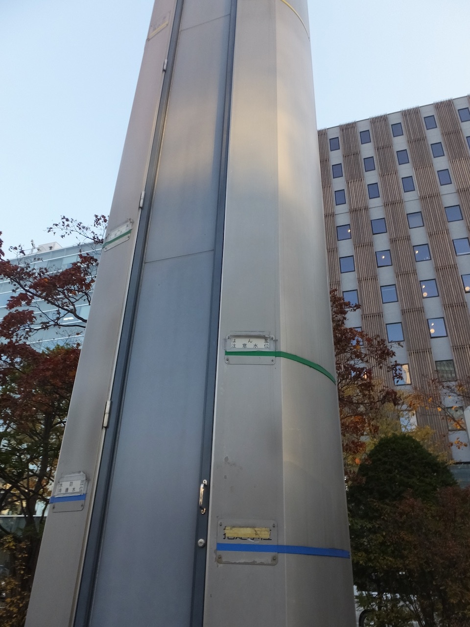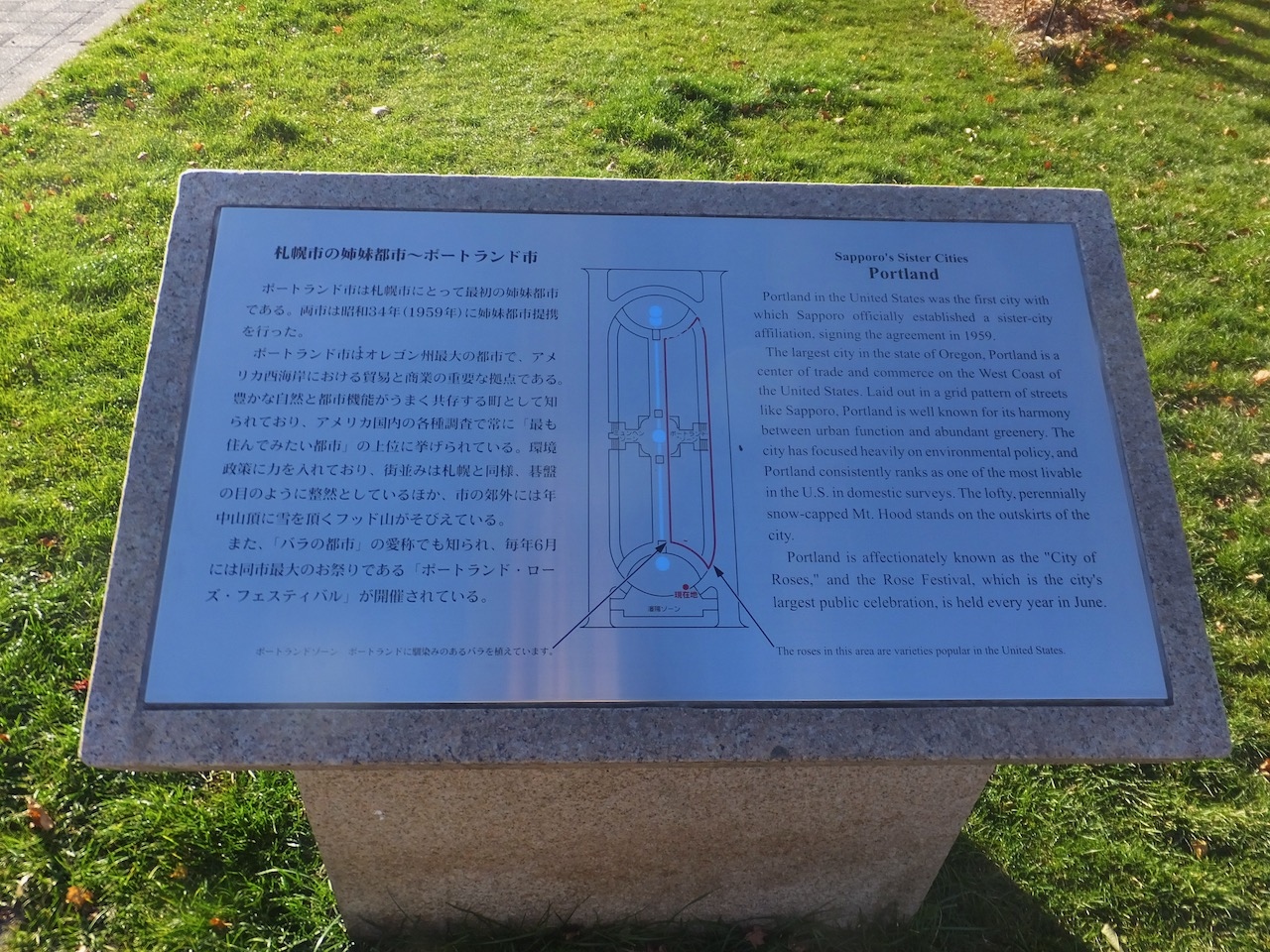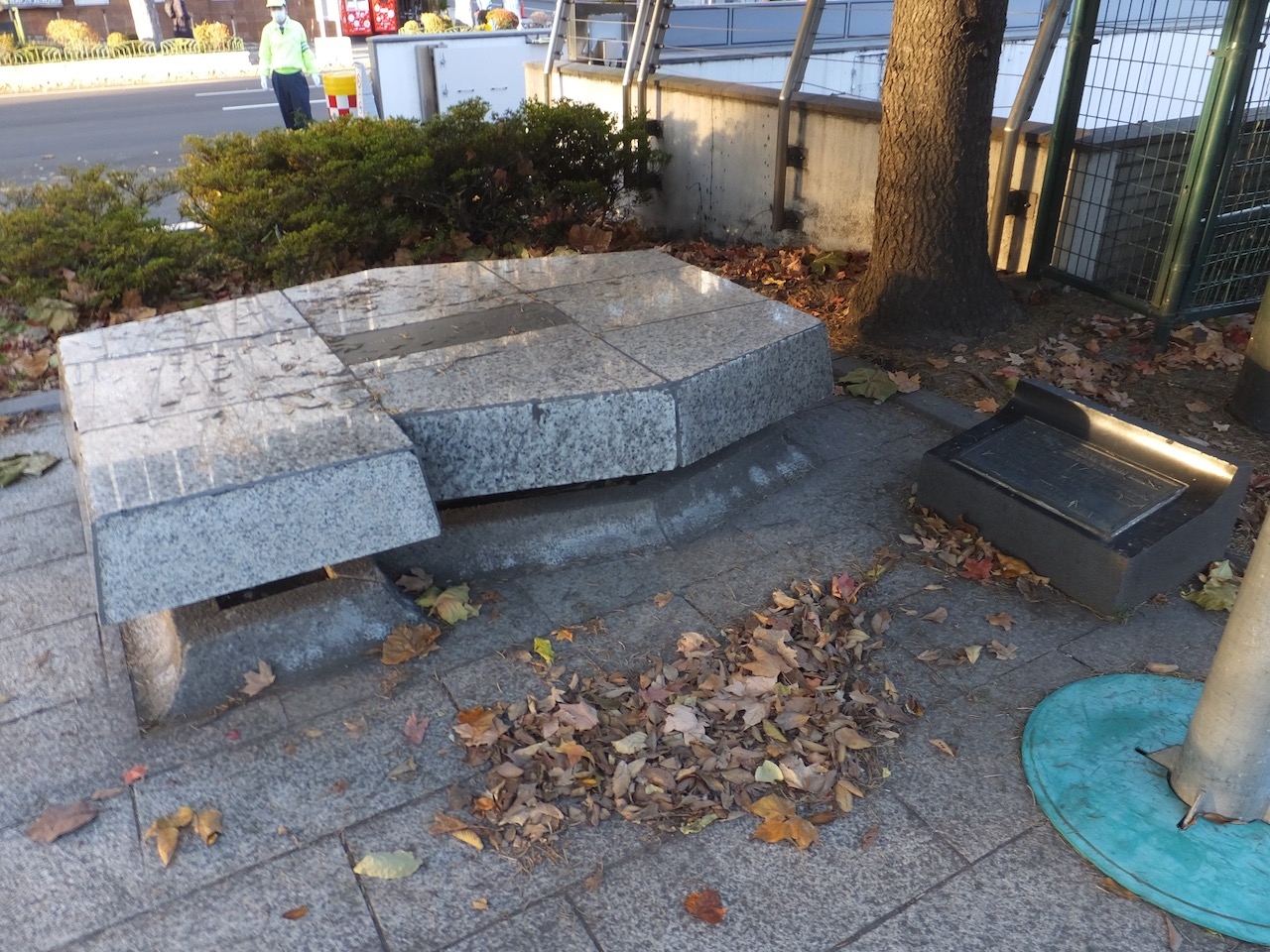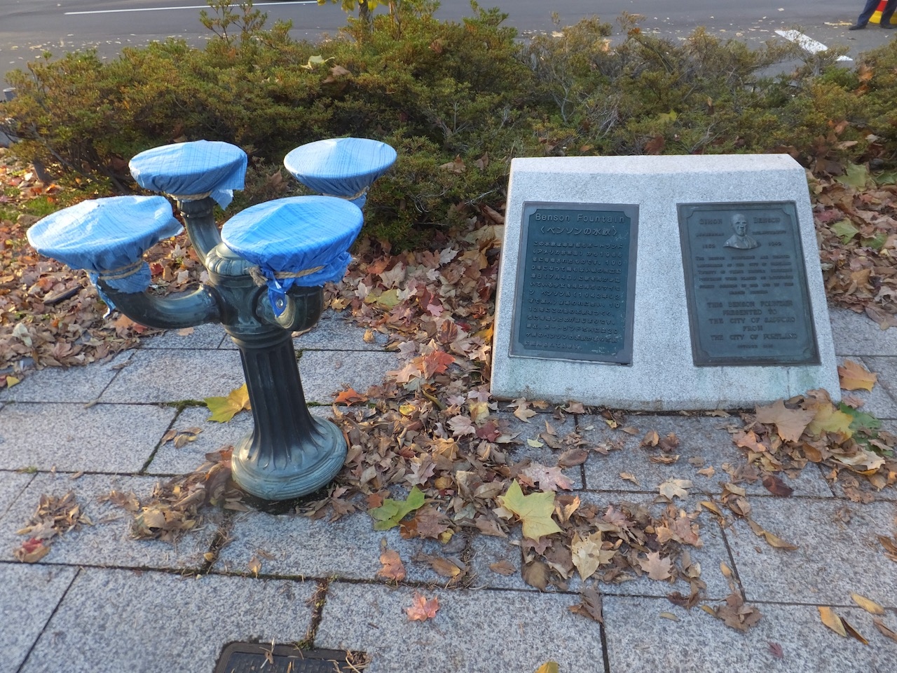 大通公園の壁泉の脇にひっそりとベンソンの水飲みに並んであります。碑版は見つかったのですが、これだけかと思ったら、後にあるベンチかと思った白い石組が記念碑のようです。ちょっとわかりにくいです。その形状と電話交換が結びつかず、それがちょっと残念。