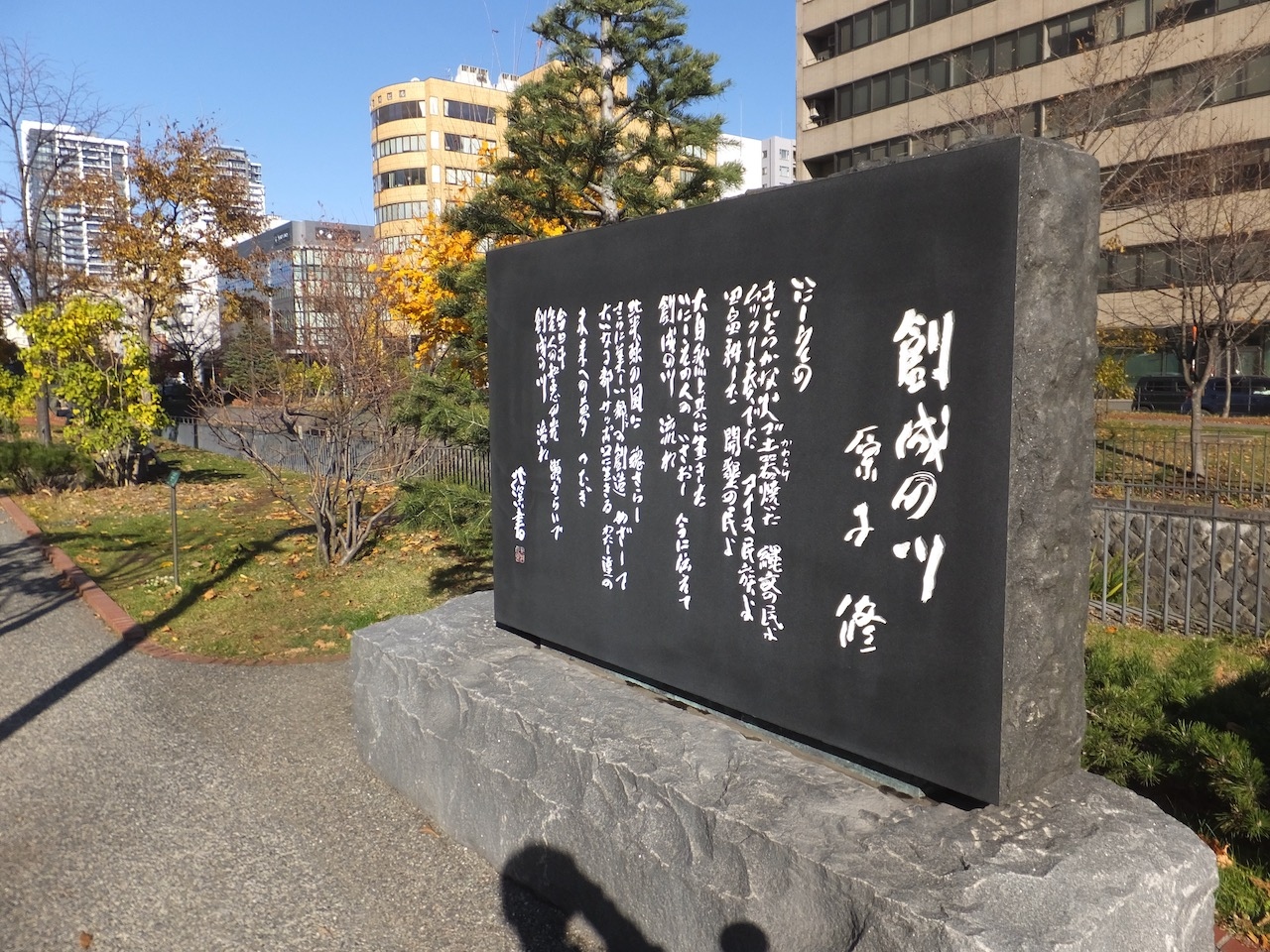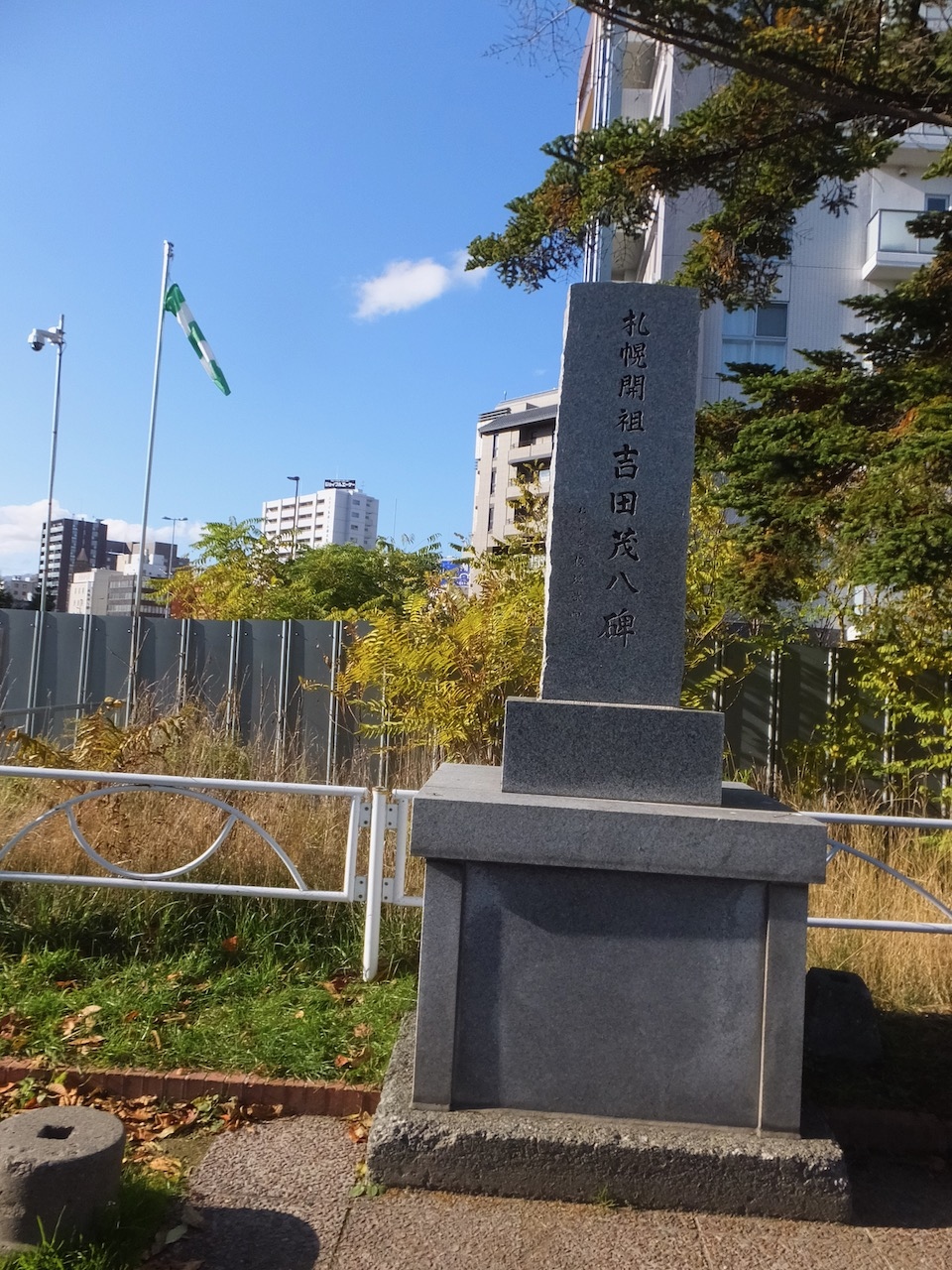 創成川の周辺には札幌の町を作り始めたころの石碑や像などがいっぱいあります。この「札幌開祖 吉田茂八碑」だけはちょっと離れて豊平川の堤防の脇にあります。創成川の南の方の一部を掘削した功労者なのですが。