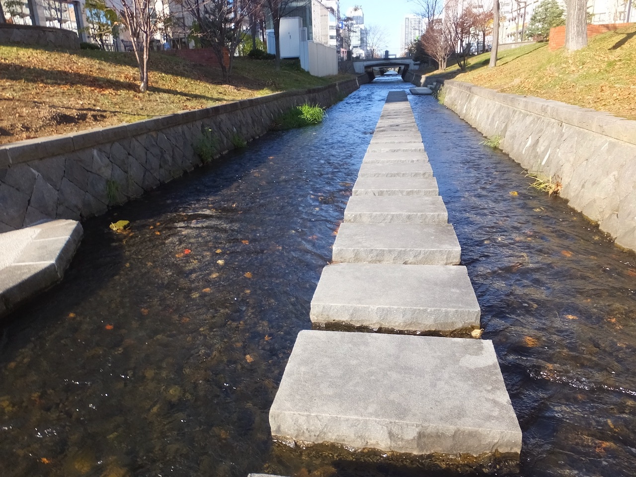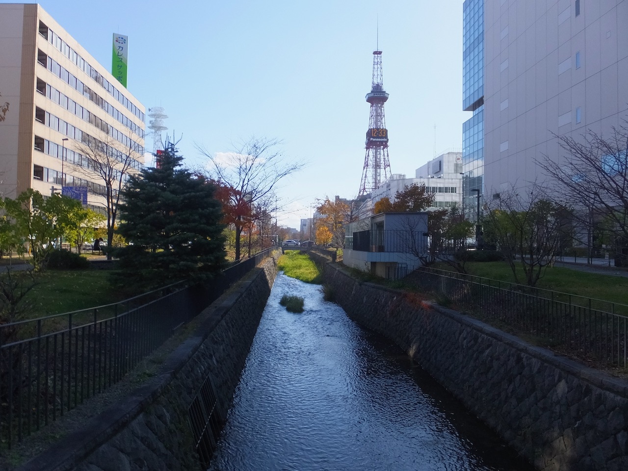 札幌駅の東側を真南に向かって続く真っ直ぐな川です。きれいな澄んだ水が流れています。あまり幅はなく、両側が緑地で遊歩道、その両側が広い車道になってます。地下は道路があるようです。そして北へ延伸されるのだとか。東京のように川の上が高速道路になったりしなくて景観が守られているのがいいですね。一部では川面を渡る飛び石や川の中を歩く飛び石もあったりして散歩にはいい川です。観光客よりも地元の方の散歩が多いように感じました。テレビ塔のすぐ裏でもあるので、観光の合間にさらりと寄れるのもいいですね。