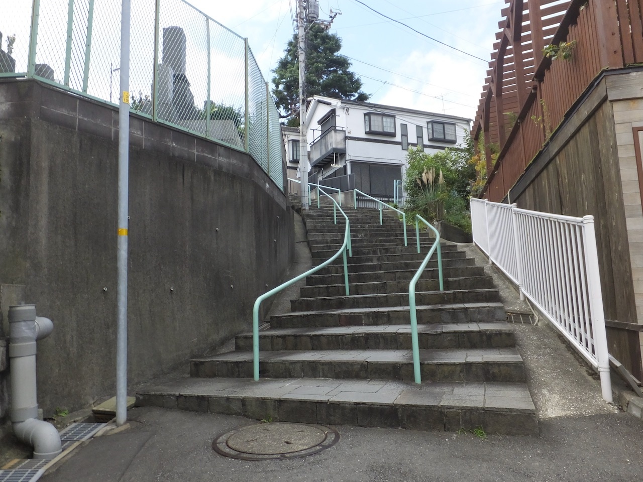 坂道(乙女坂)の頂上付近にあって、坂に立っているので地下室も含めて2階建のように見えます。