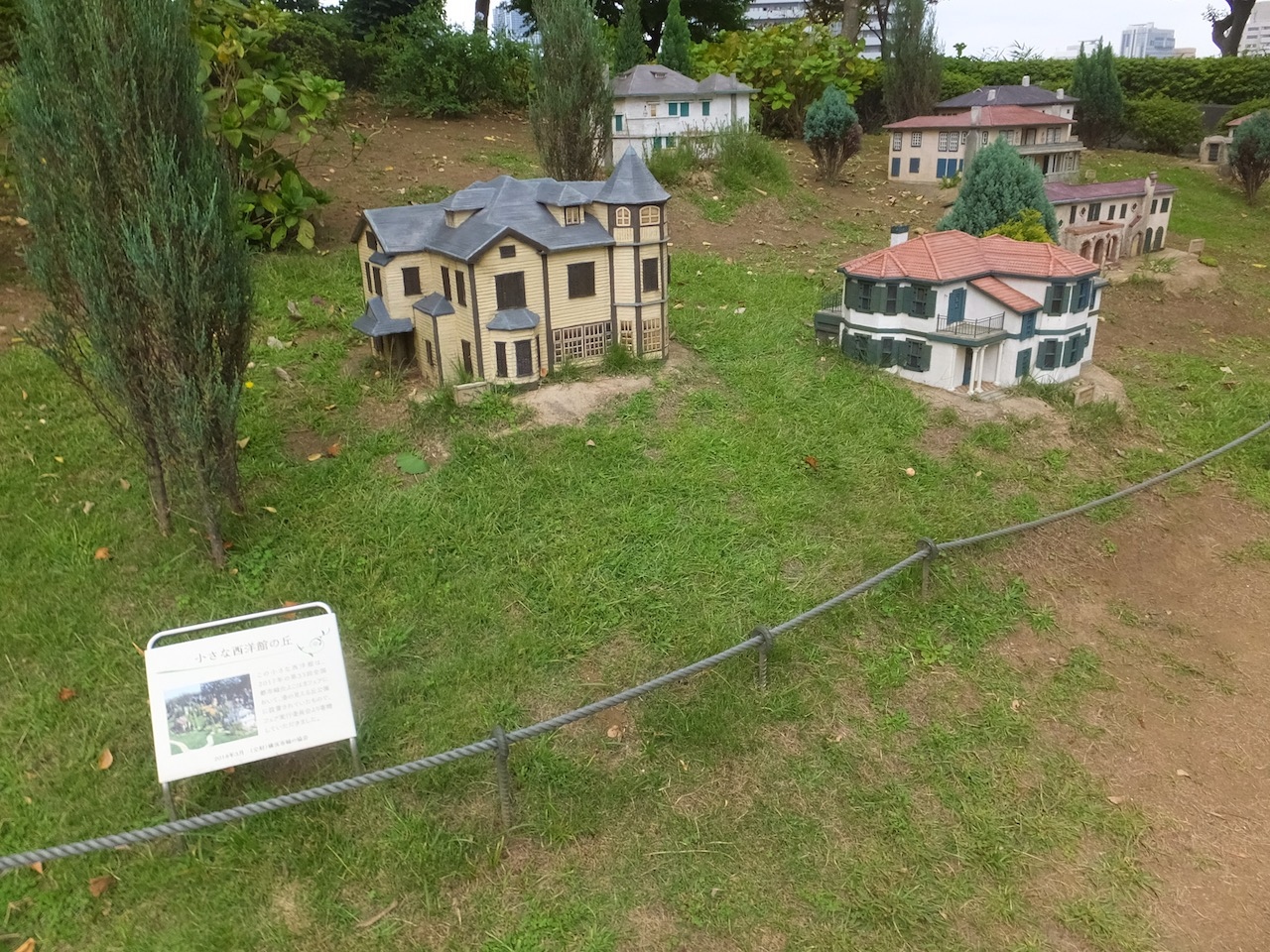 整形されたきれいな庭園。花がきれい。西洋館のミニチュアがある。
