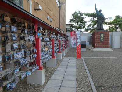 十字街のやや函館駅側。市電通りに面して銀行とコンビニの間の細長い広場の奥に銅像が立ってます。なのでちょっと気が付きにくいです。手前は絵馬がいっぱいあって神社の参道のよう。坂本龍馬記念館の宣伝のためとも思いますが、その坂本龍馬記念館は市電通りの向かい側。なにか不思議な空間です。