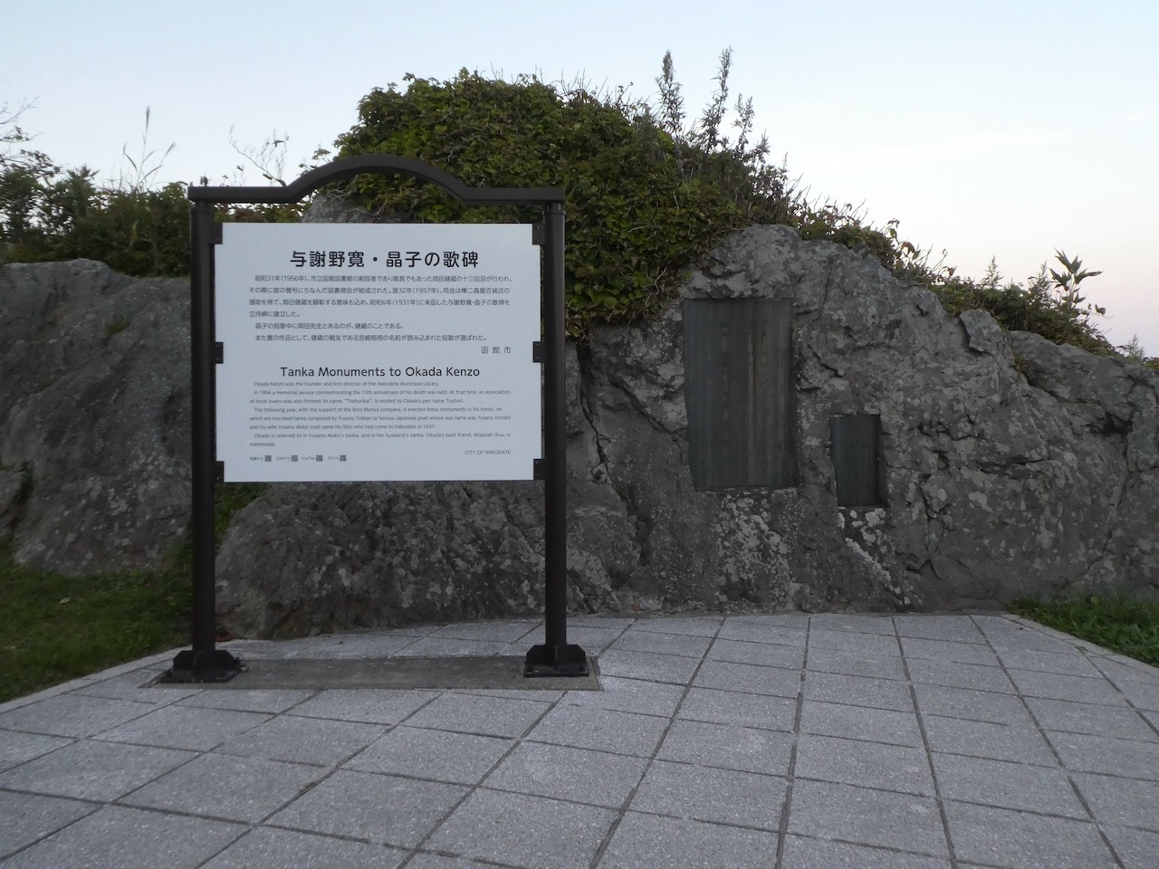 立待岬は公園になっていますが、立待岬の駐車場の岬と反対側の隅の方に、奥に続くちょっとだけ草地、その一番奥に大きな石碑が。それがこの歌碑です。自然石の表面を削って歌を彫った御影石をはめ込んであります。なのでちょっと目立ちません。看板があるからわかる、という感じです。石には御影石が2枚はめ込んであるのですが、その大きな方が歌碑で、夫婦2人分が書いてあり、もう一方は建立のいわれ、でした。