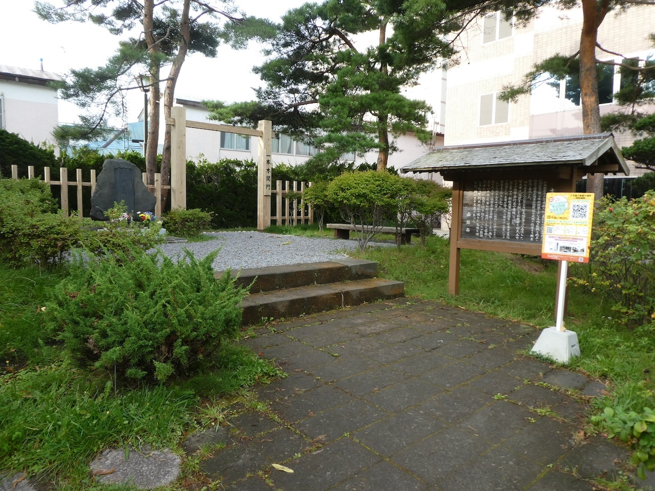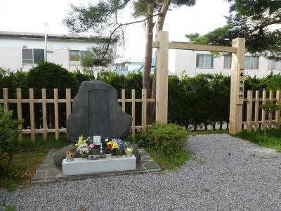 さて、公園内の奥の方に、戦死したとされる一本木関門のような門があり、その手前に石碑があります。花と写真が添えられ、訪問者が多いのだろうなあ、と思います。砂利もきれいで最近整備されたような門とあわせ、大事に守られている印象を受けました。- 旅行時期