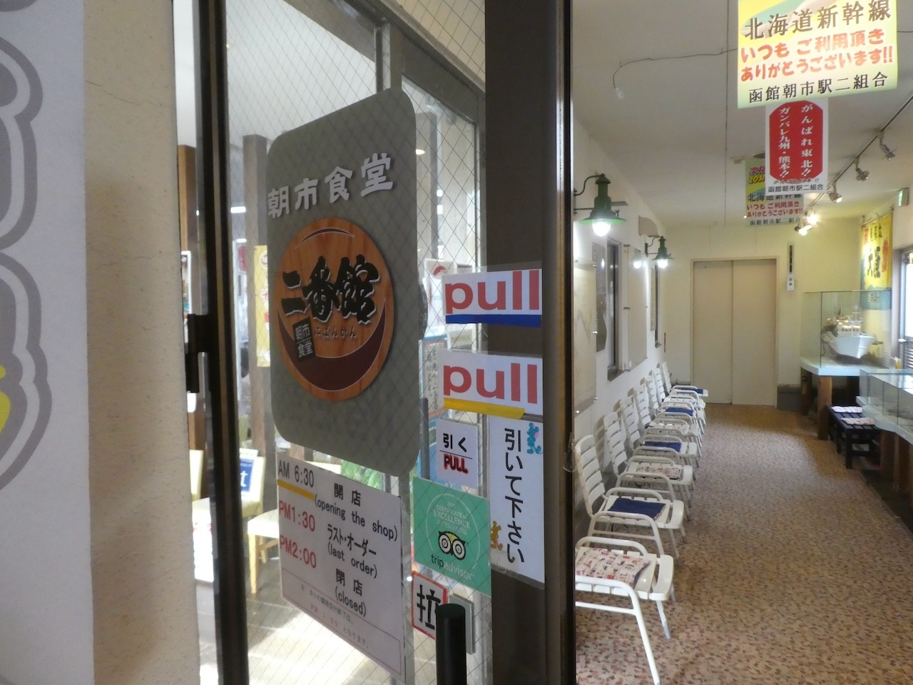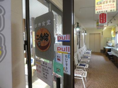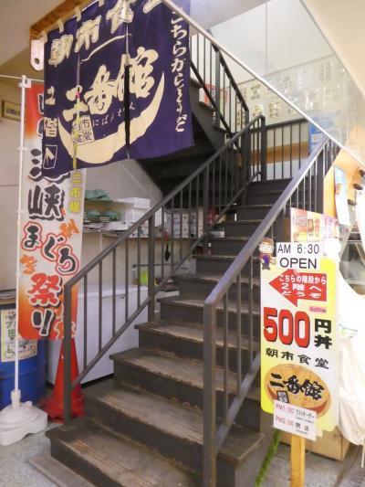 函館の朝市の駅二市場の2階にある食堂です。市場のビルの中からの階段がメインの入り口のようですが、朝市のメインストリート側の外階段からも入れます。