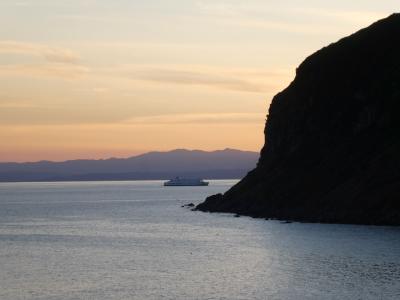 沖をフェリーが通ることがあります。青森からのフェリーがこんな方向からやってくるのか、とちょっとびっくりします。函館の街がこの函館山の裏に広がっているので青森からのフェリーはぐるりと回り込んでくるんですね。