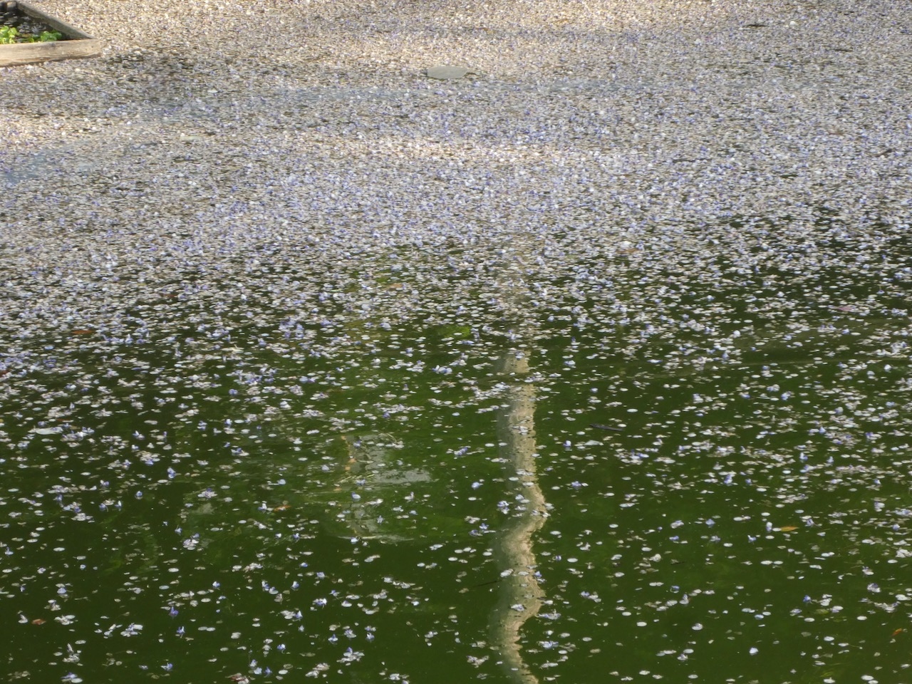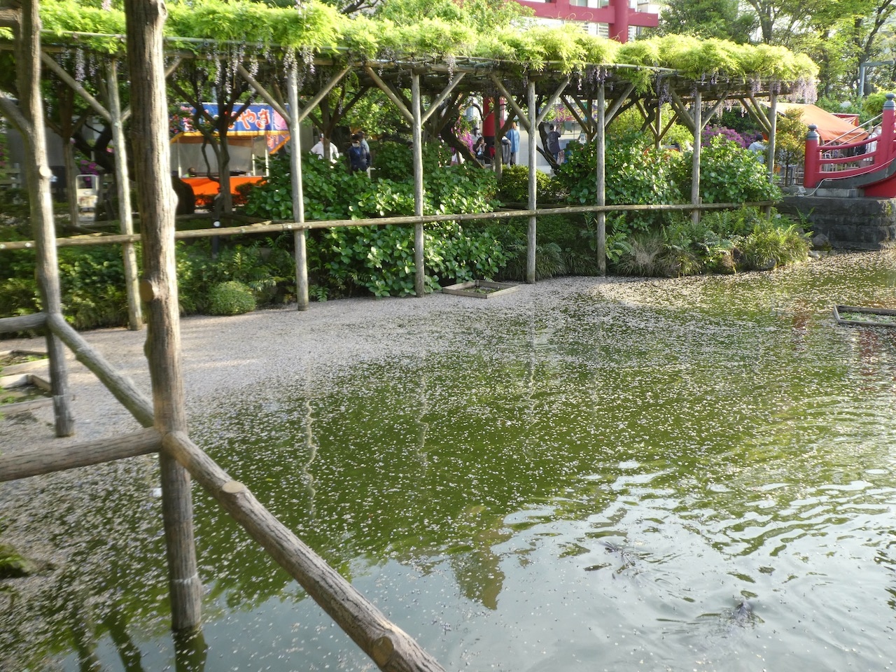 ゴールデンウィーク中までは藤まつりを開催してますが、できればゴールデンウィークの前に行った方がいいでしょう。花の盛りがそのころのようです。2021年はさらに早かったようで、4月26日でもうほとんど散り終わっていました。それでも池に浮かぶ花筏がきれい。花の後になってしまった場合はこんな鑑賞法もあります。