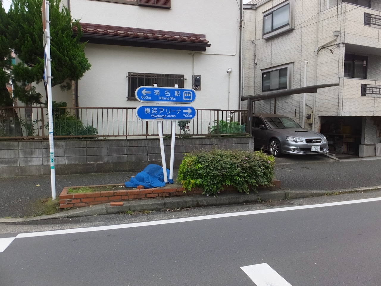 新横浜が最寄りの横浜アリーナですが、東急線の菊名駅からでもまあまあ近く、歩いて15分くらいです。途中には菊名までの距離と横浜アリーナまでの距離の書かれた案内板もあったので歩く人も多いのだと思います。東急の線路に沿って東京方へ、左へ左へと丘の麓を廻って、新幹線の高架が見えたらくぐり抜けて、大通りに出たら左へ。行きも帰りも迷うこともなく単純な道でした。