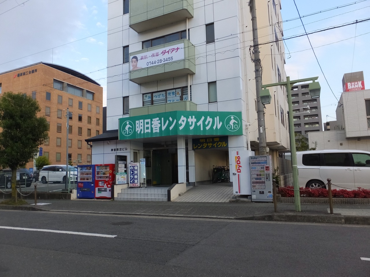明日香のレンタサイクルは、近鉄南大阪線の近鉄飛鳥駅からでもいいのですが、ここ橿原神宮前の方が京都方面からの場合は便利です。橿原神宮駅は出口が3箇所ありますが、京都方面から来ると一番近い東口の駅前広場の向こう側になります。緑色の看板が目立っているのですぐわかるでしょう。バス乗り場の真正面でもあります。