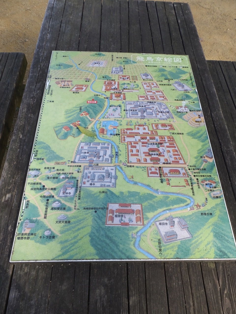 頂上の展望台広場に、昔の飛鳥の地図があり、お寺だらけだったことがわかります。現在の眺めと対比させて見てみるとのどかな農村に京の姿が浮かんできます。