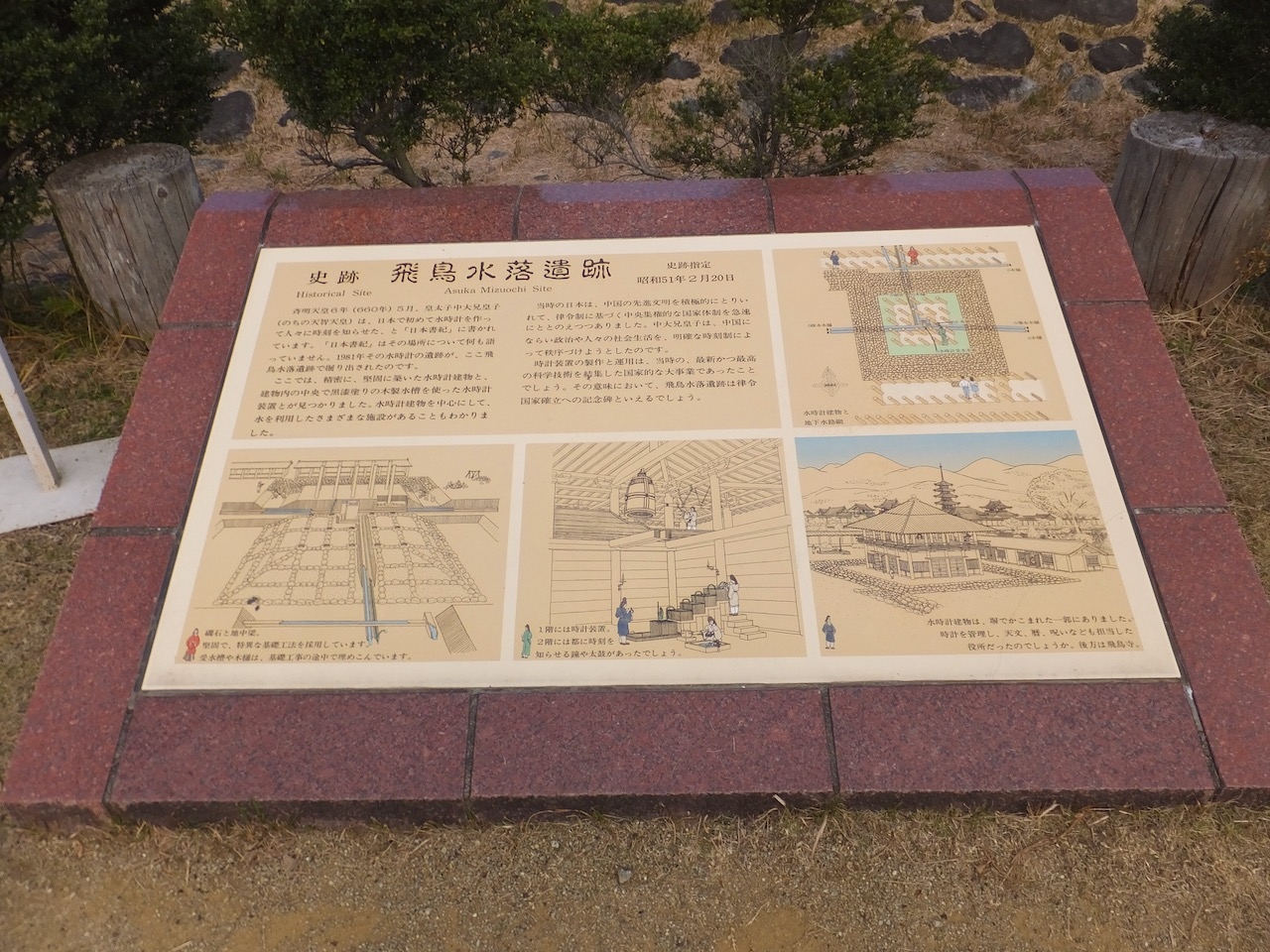 さすがに飛鳥時代の遺跡になると、建物はなく、礎石や遺構だけになります。この水落は地名かとおもったら、「水が落ちる」の意で、要は水時計の遺構でした。礎石と遺構だけでは何のことかさっぱりわかりませんが、その詳しい図解があってはじめて全容がつかめました。水を一定間隔で段々に落とすことで時計にしていたようです。水を落とすのに落差が必要でかなり大きな建物だったようです。当時最新式の時計を備えた役所だったということです。