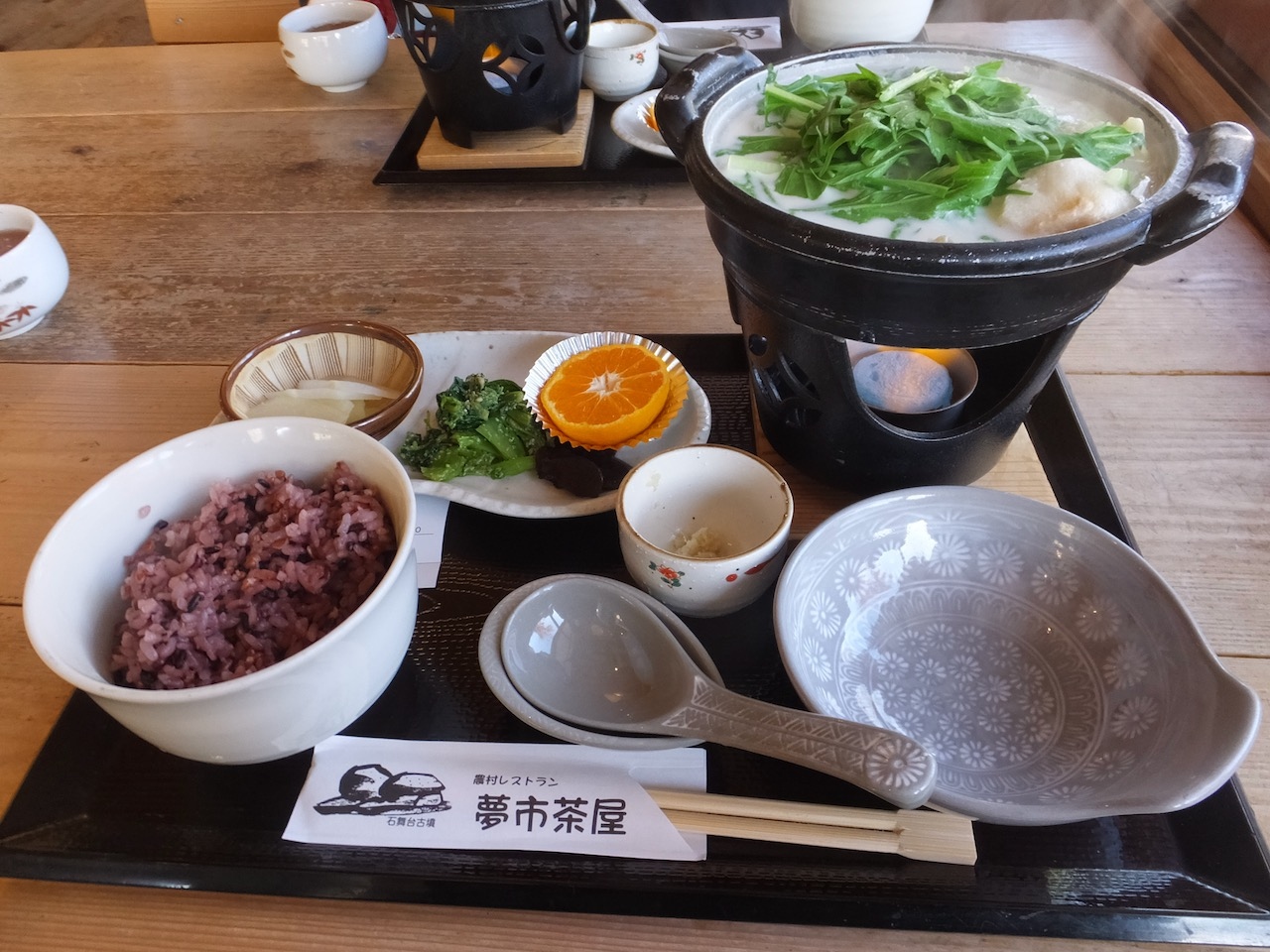 さて、名物料理でもある飛鳥鍋御膳1250円です。昔っぽい古代米のご飯と鍋。観光地なのでこれくらいでしょう。